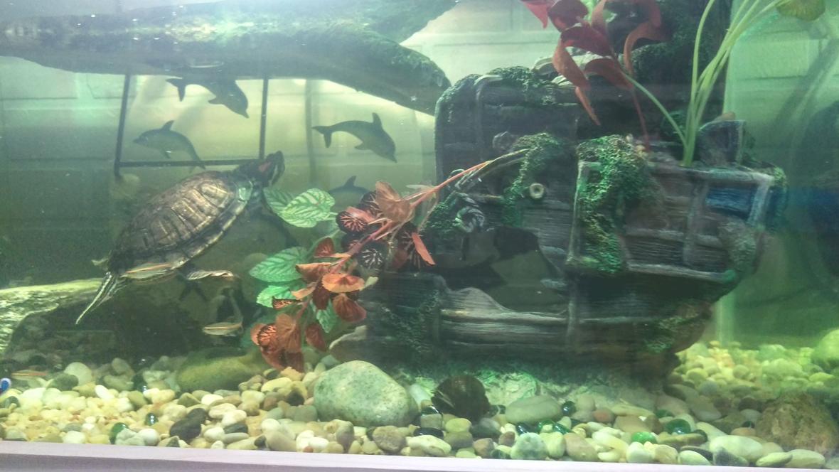 100 gal tank filled with about 75 gal to allow for turtle basking area. Main function is supporting red eared sliders RES also have Mystery snails. Filter is a Laguna skim away pond skimmer. Light is exo terra ballast with uva uvb and heat all in one basking lamp.