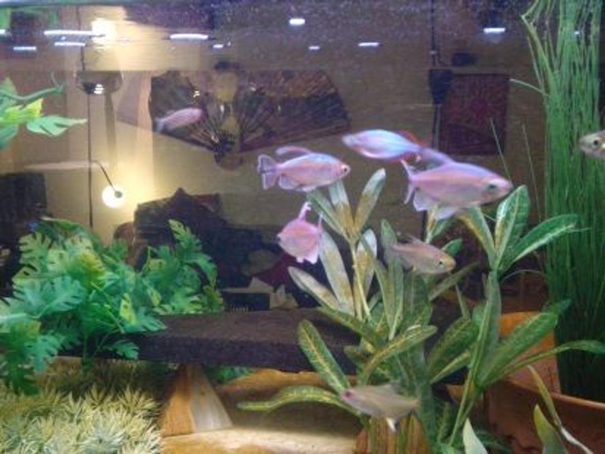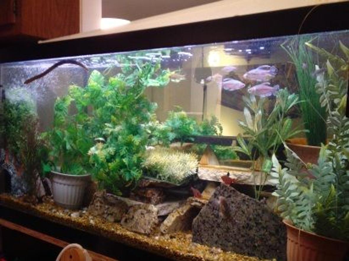 plastic plants--i'm trying to keep the maintenance low--used to grow live plants in a 55 gallon---look to your local granite or marble dealer for scraps---the pieces in this tank were all no cost---