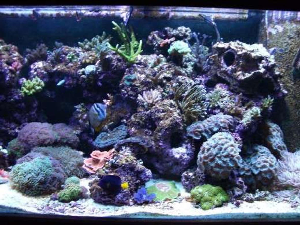 Standard AGA 180 reef ready 72x24x24. (6) 250 watt DE halides in PFO mini pendants. (3) Ushio 10K's, (3) AB 20K's all on Icecap ballasts plus 440 watts of VHO O3 actinic. The main return pump is as Sequence Manta ray that runs the return and all support equipment. Custom 100 gallon sump with a built in refugium. Precision marine Bullet 3 skimmer. Precision Maring CR 422 calcium reactor with effluent chamber. Red Sea 100 mg ozone unit. (2) 1/2 hp chillers. Tunze TS-24 stream kit with the streams in Tunze deco rocks.