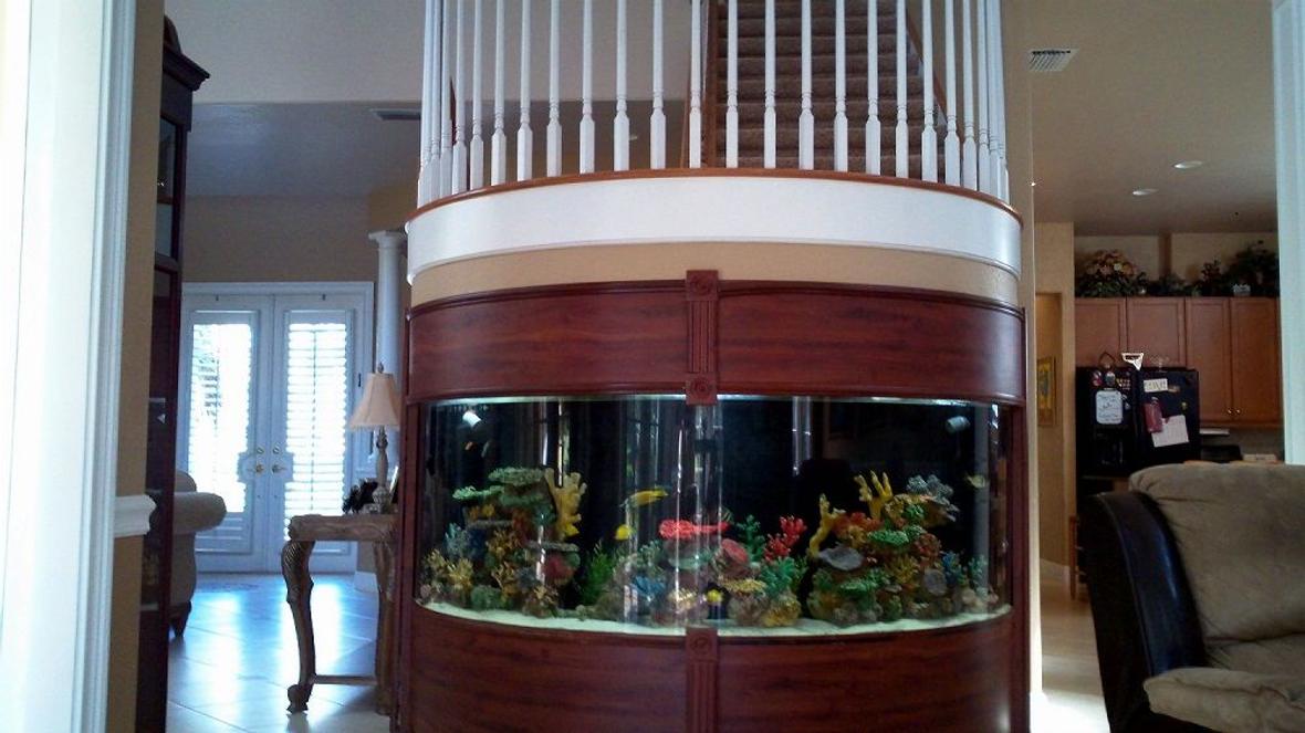 Custom built around staircase saltwater reef tank. About 250 gallons. Many fish kept over the years from angel fish to nurse sharks and octopuses