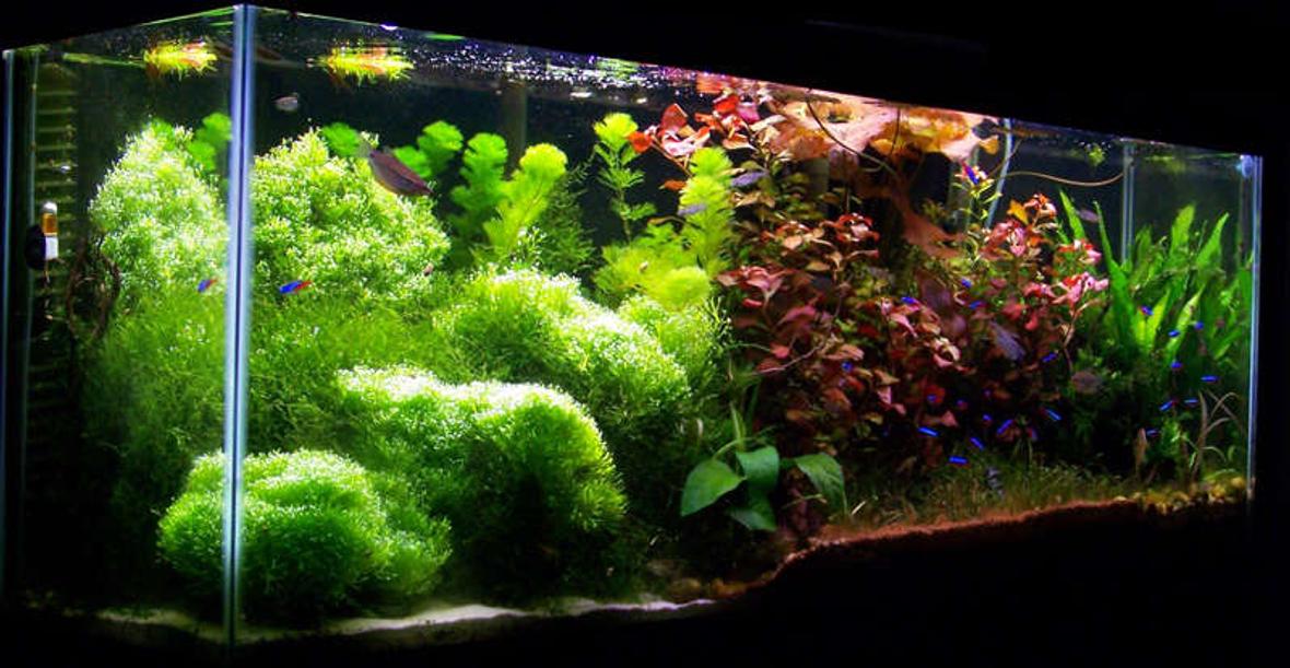 The left of the tank is Riccia fluitans and Vesicularia dubyana tied down onto a system of hollow rock caves on a sand substrate.