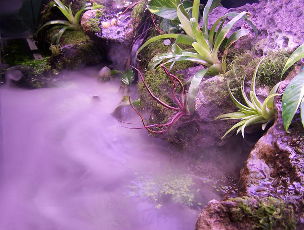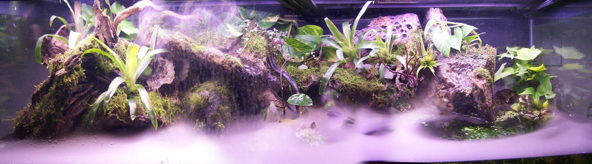 A Paludarium, both land and water. Trying to create a beautiful balance between both worlds. The tank is a 80 Gallon 48"w x 18"d x 22"h. Hagen fogger, varying bulb color / temp. Co2 injection, custom built moon lighting. 48" Orbit 4x65W SunPaq w/Lunar Lights/Fans (Current) + 40 watt Flora Glo fixture. In the pictures I had 140 watts of light. Need to update since all the additions.
