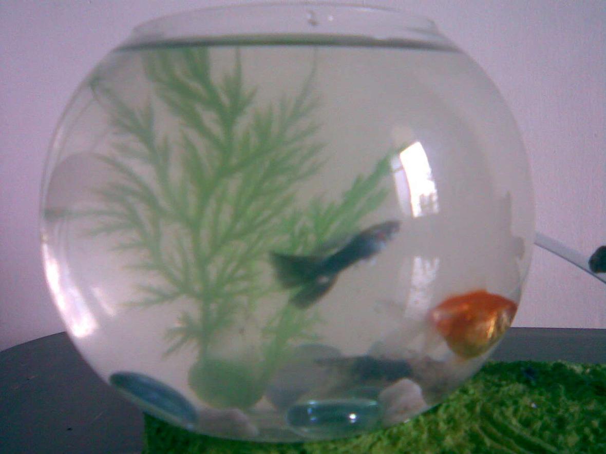 a small bowl with few beautful fishes like guppy and gold fishes