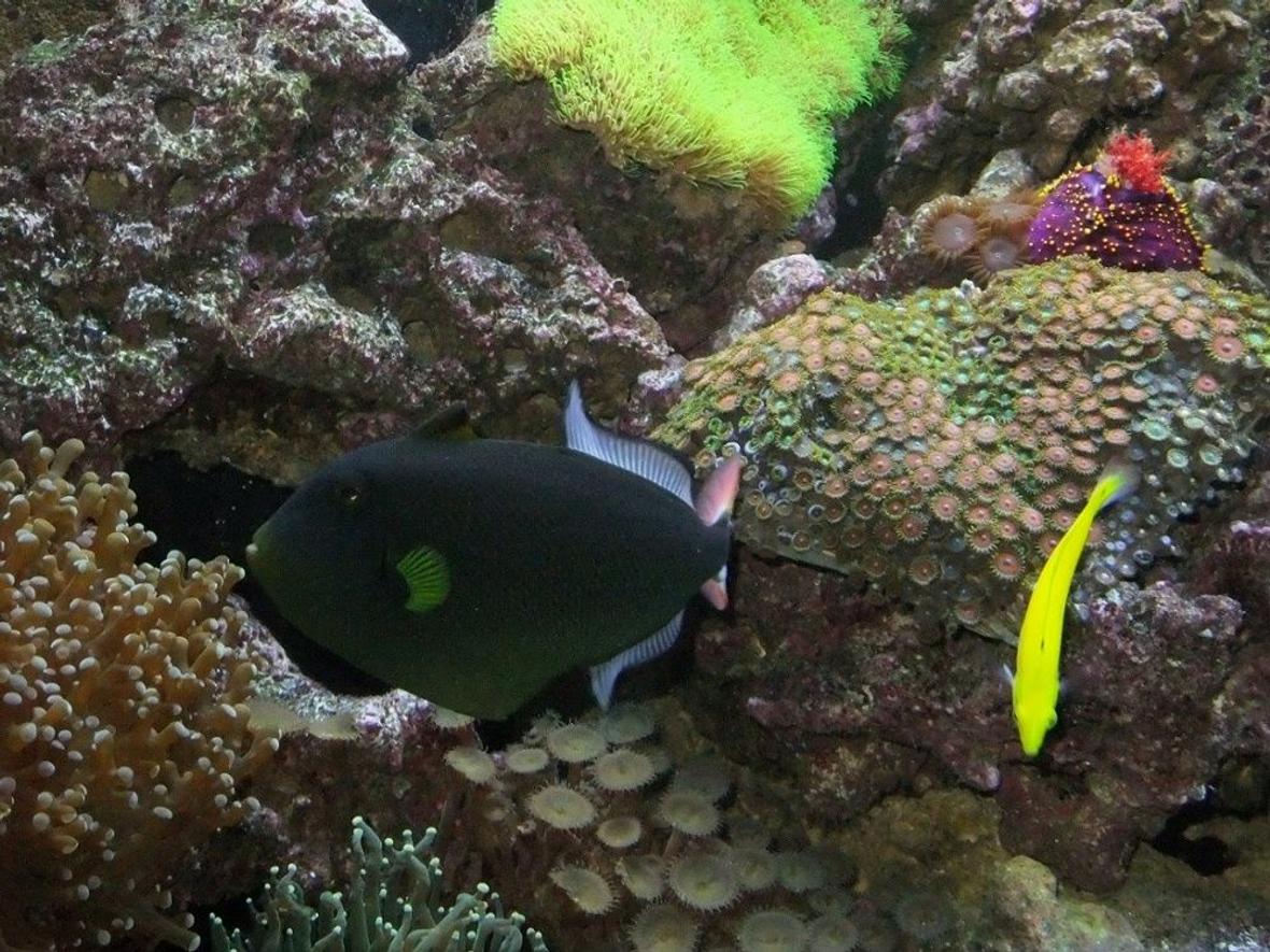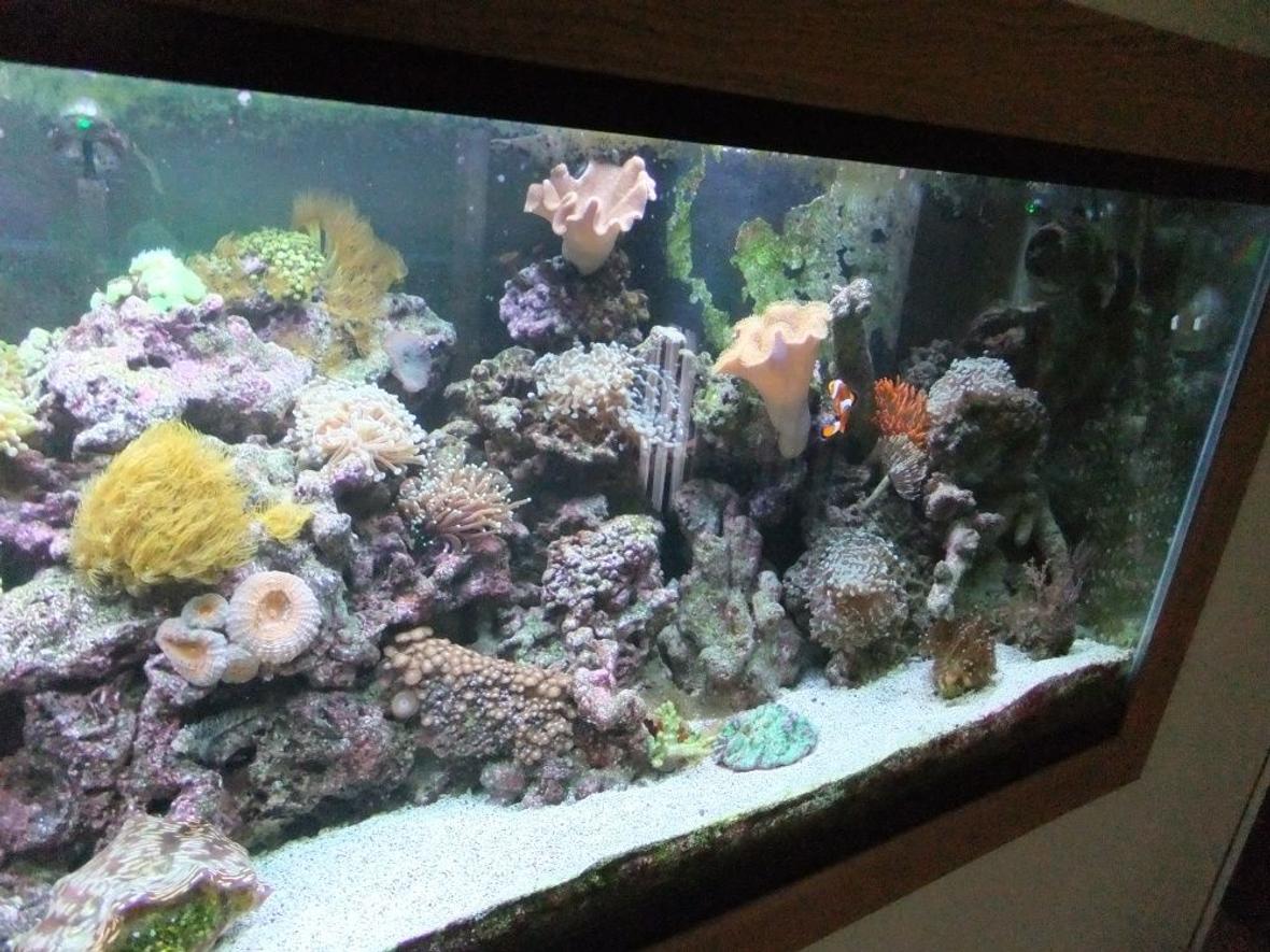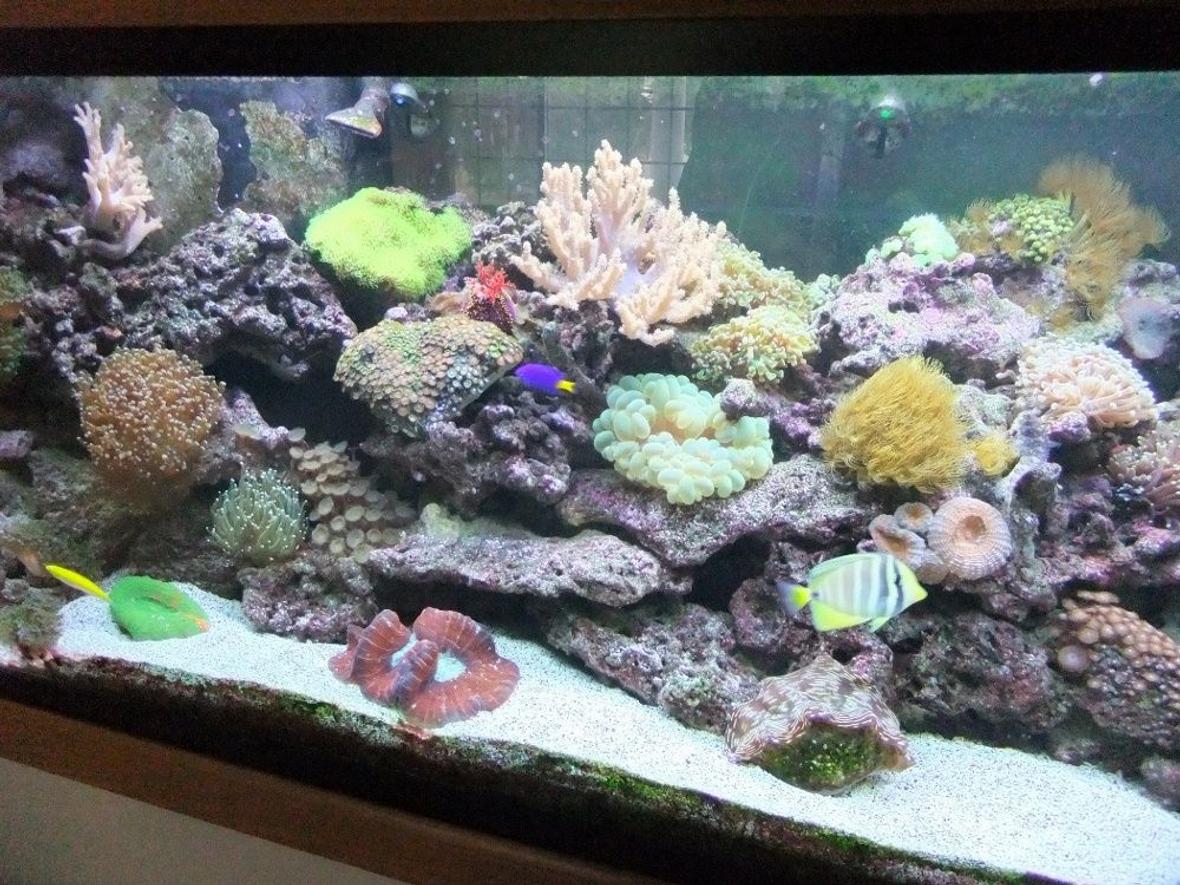 Pink Tailed Trigger, Percula Clown, Yellow Tail Damsel, Diamond Back Gobby, 2 yellow Corris Wrasses, Yellow Tang, Stripe Tang, Coral Beauty, Watchmen Gobby, and a few snails, Bleeding Sea Apple, and 2 cardinals.