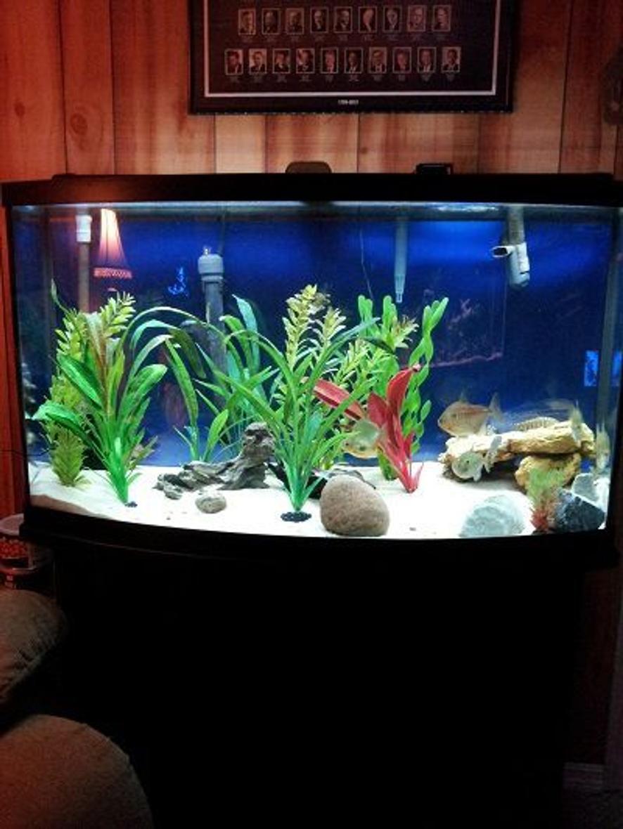 36"w bowfront, fluval 304 canister with aquaclear 70 hob. 200w heater @79degrees. led lighting.