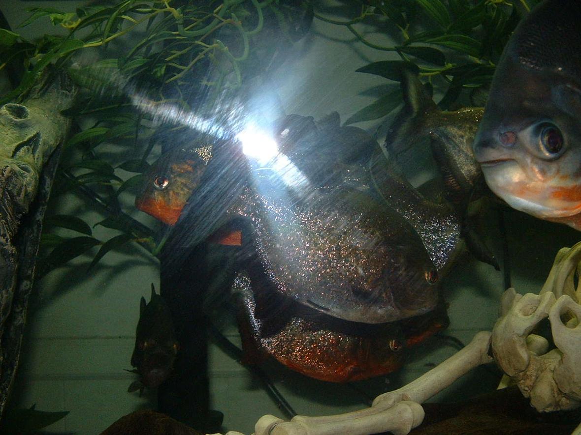 1 big fat Pacu and 10 Piranhas a black knife fish that hides all the time.