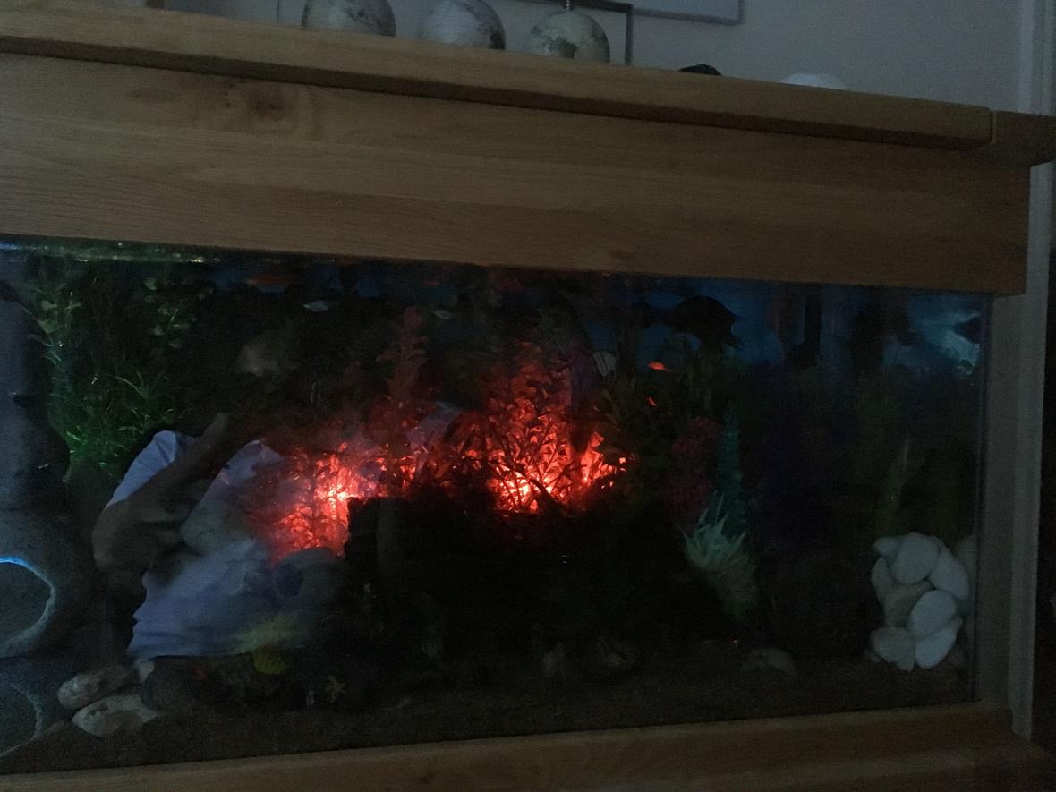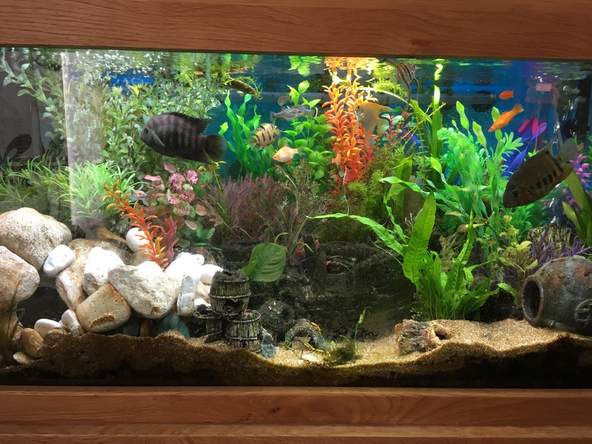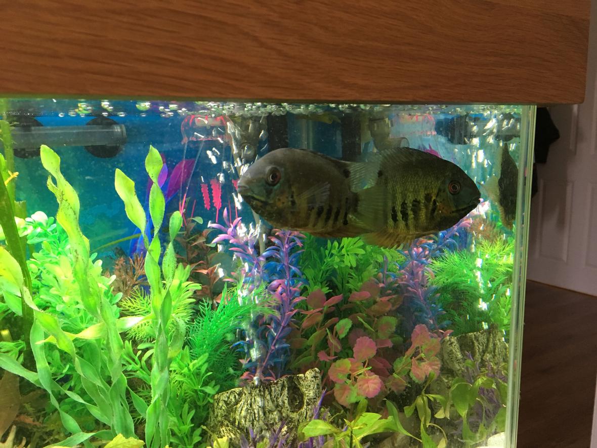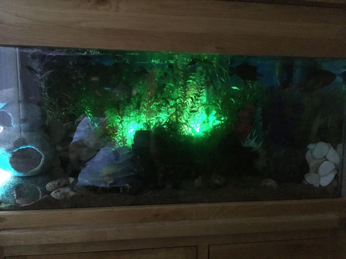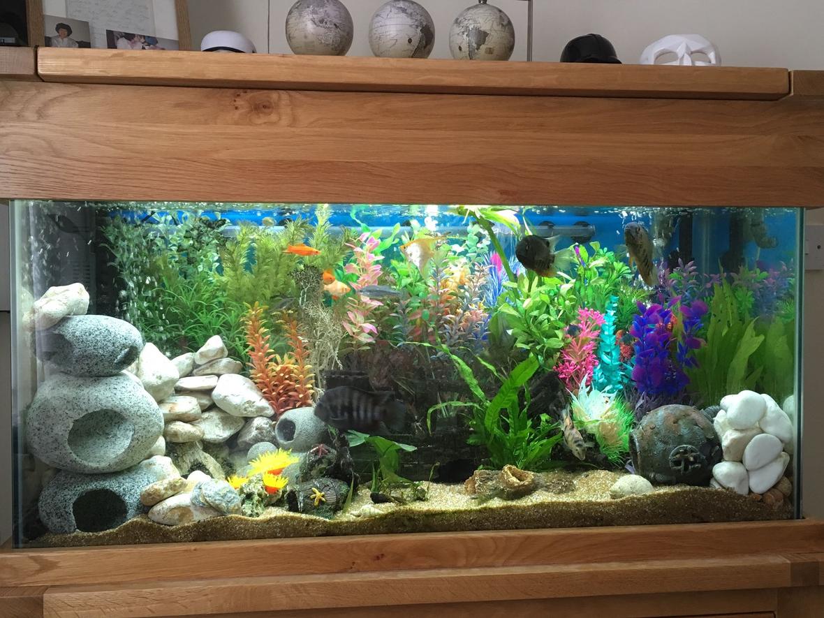 Aqua Oak 110Cm (200l): 110cm x 45cm x 136cm. Aquarium Dimensions:99.5cm x 40cm x 50cm. External Filter: AquaManta 200. External Filter: AquaManta 300. Internal Filter: Aquael 500 x2. Fluval E Advanced Electronic Heater, 300w. Temp Kept at 77f/25c. Hailea Air Pump X4. Interpet LED Bubble 34cm. 5050LKED Bubbles Light. Airstones x2.Fish:Koi angelfish - x2. Clown Loach - x2. Weather Loach - x3. Gibbiceps - x1. Convict Cichlid - x2. Spotted Severum - x2. Rambo (Rhombo) Barb - x4. Pictus Catfish - x1. Humbug Catfish - x1. Red Wag SwordTail - x2. Gold Red Fin Barb - x1. Black Kuhli Loach - x4. Butterfly Goodeif (Split Fin) - x5. Green Tiger Barbs - x3. Golden Tiger Barb - x3. Pakistani Loach - x4. Rabbit Snail - x2.