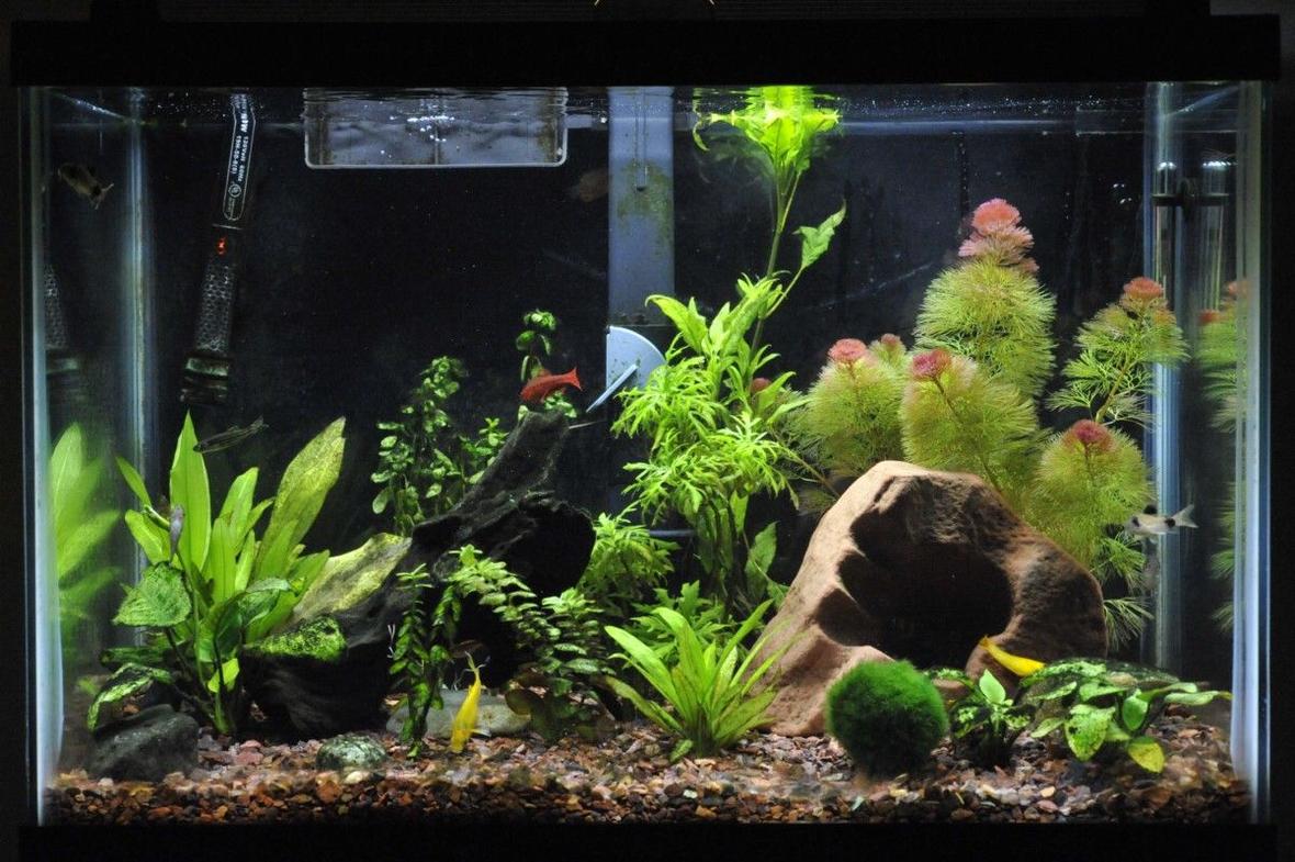 YoYo Loaches, Bolivian Ram, Harlequin Raspora, Zebra Danio, Cherry Barbs, Black Mollies, Panda Cory, two other Cory varieties, Red eye Tetras, and Ottos.