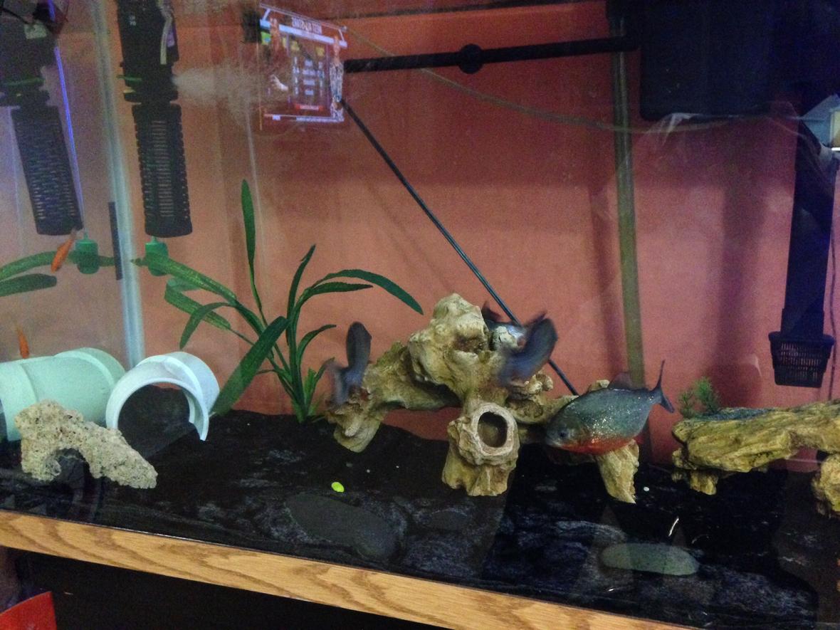 I have a 90 gallon freshwater tank. I have Four Red Belly Piranhas, 1 Jack Dempsey, 1 Pleco, and 1 Convict, and two goldfish left (snack). I have a powerhead, a blue neon led strip, black premium sand, and a propeller to keep the current heavy. I stuck a 4" PVC elbow in there as a hiding spot and house for my Jack. My piranhas killed his brothers.