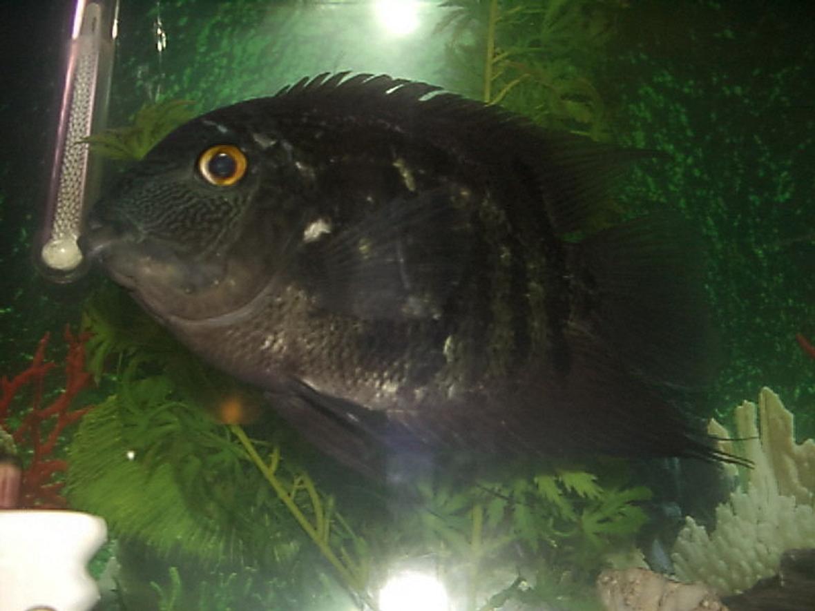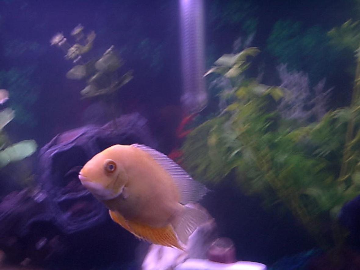 New at this, not sure what all to list! This is a 55 Gallon LONG FreshWater Tank. Whisper 60 filteration system, Two All Glass Aquarium Pre-Heat Flourecent bulbs 15 W. each. My tank was JUST set up in this photo & medicen was JUST added so it is Foggy. My Golden Severum was a Very Sick Fish when i got him from poor living conditions & care. he is Quickly on his way to recovery and is Starting to look MUCH better already!