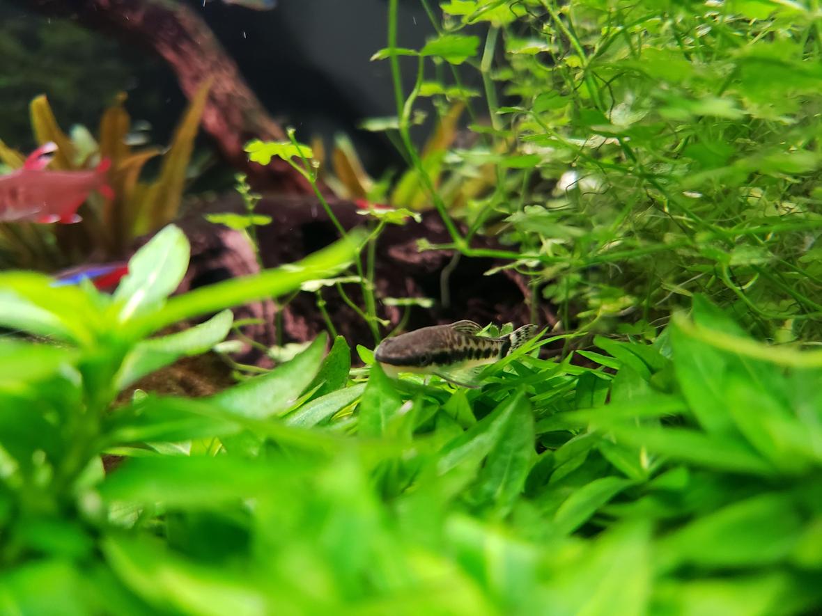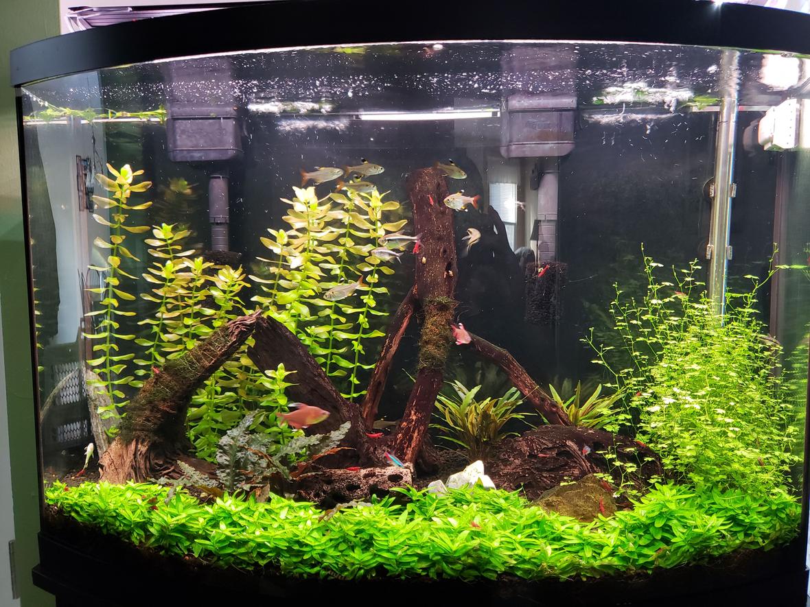 36 gallon bow front; Filtration: Fluval 306; Lighting: Finnex Planted + 24/7; Substrate: Fluval Stratum; Community fish and Red Cherry Shrimp