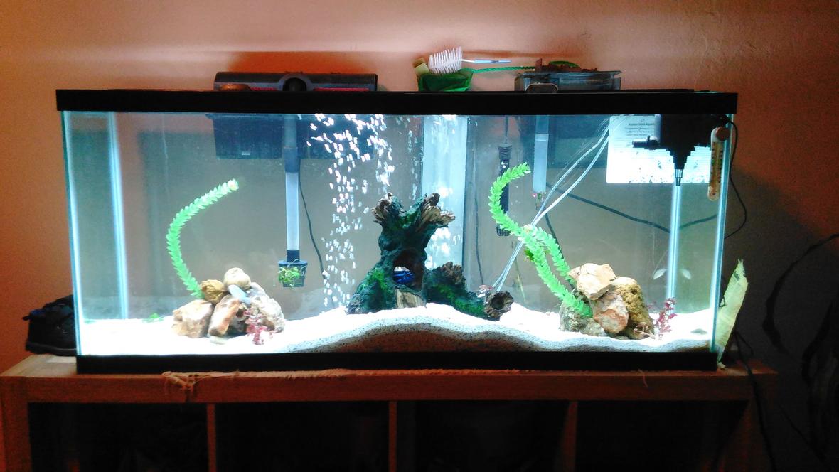 My tank is a fresh water African cichlid tank I have 2 cichlis in a 55 gallon I have a cobalt blue zebra, and a maingano cichlid,also I have a thomasi pleco l,juli catfish, and a emrald green catfish and a70 gallon fluval pump filter and a 60 gallon tetra filter and a 55 gallon power jet also with a fluval sky effects 3000- 25000k led high powered lighting system..for sand I have 40 pounds of aragonite substrate and about 4-5 pounds of black sand