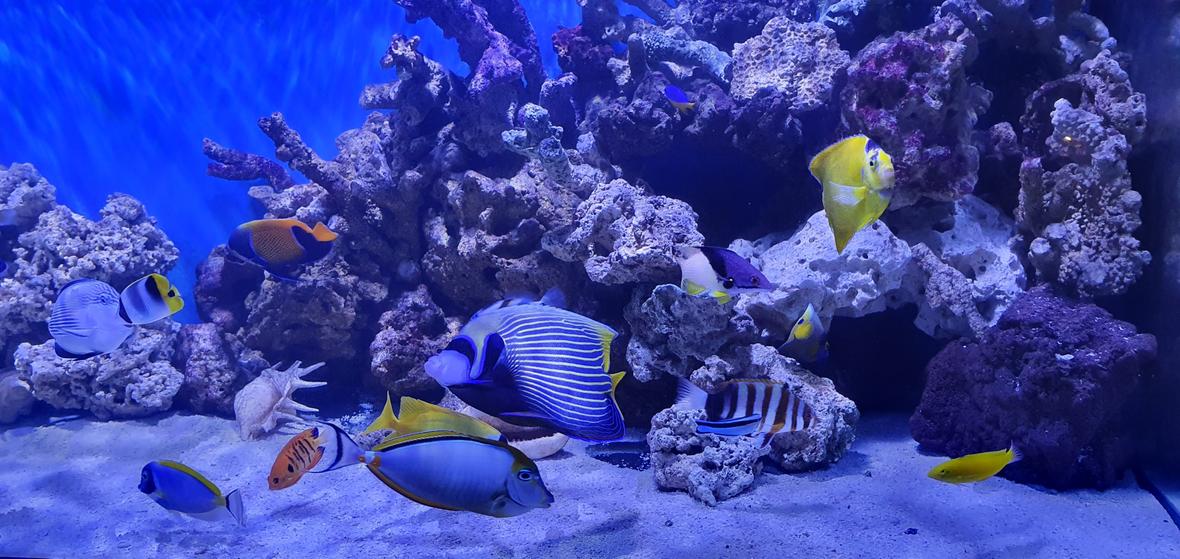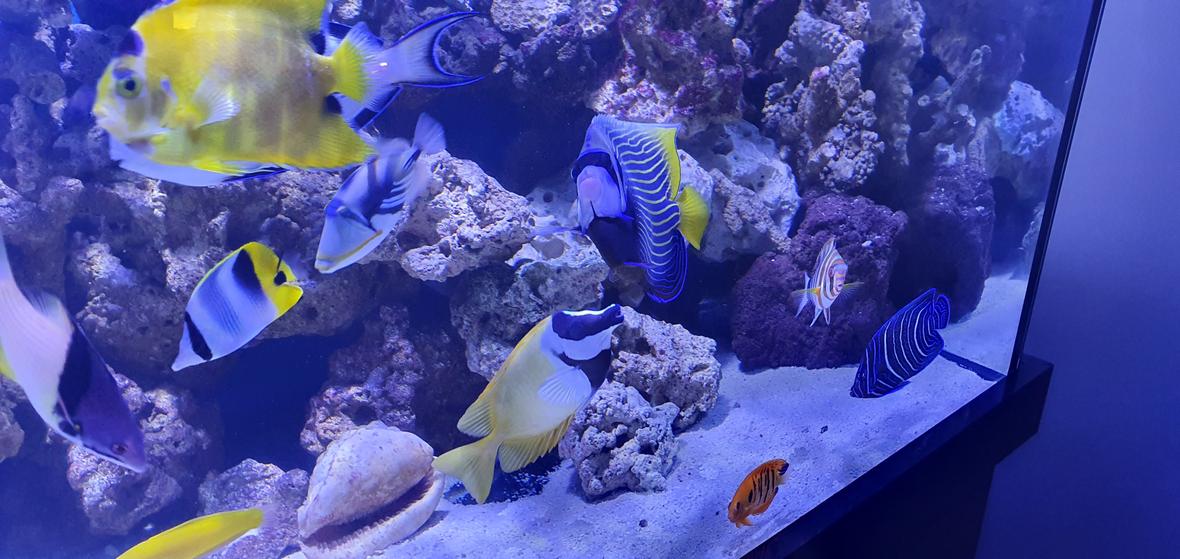 Humu Picasso Triggerfish, Yellow Wrasse, Cleaner Wrasse, Naso Tang, Sohal Tang, Powder Blue Tang, Blue Damselfish, Maroon Clownfish, Flame Angelfish, Queen Angelfish, Koran Angelfish, Blueface Angelfish, Emperor Angelfish, Regal Angelfish, Foxface Lo