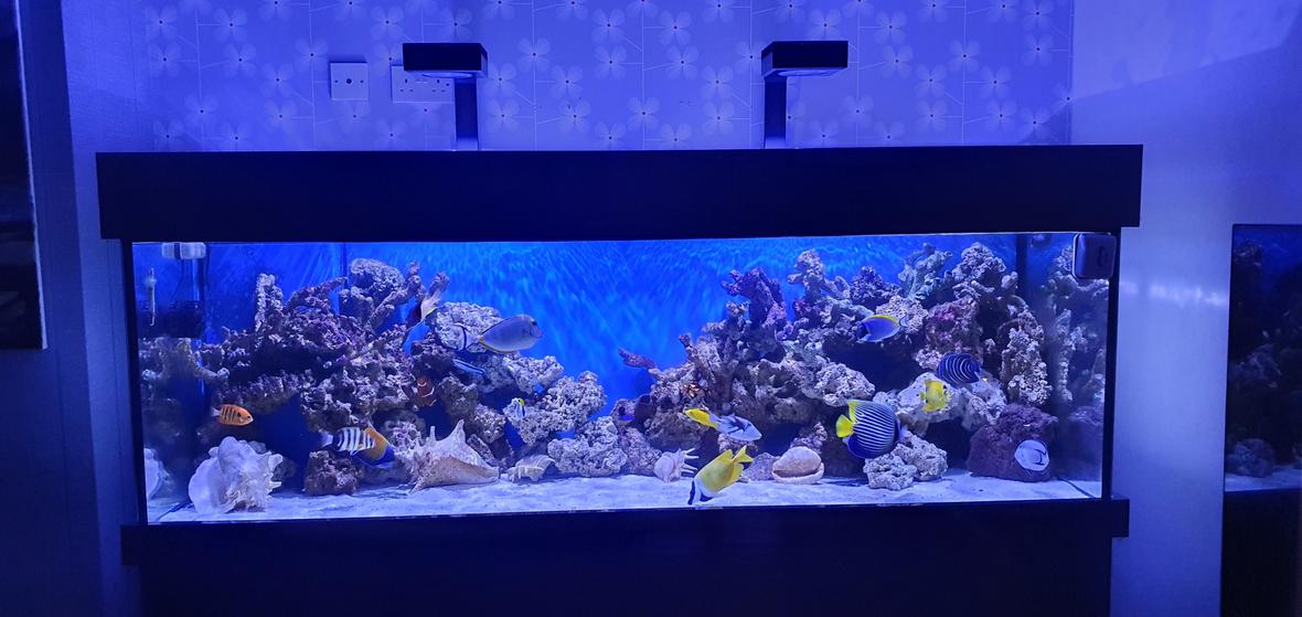 Fish only with living rock marine aquarium. 6ft x 2ft x 2ft. Sump underneath including skimmer return pump, heater, top up reservoir and uv unit. All pumps TMC, skimmer is bubblemaster. Also TMC wave maker, lighting is Red Sea. Fish species: Tangs, Triggers, Wrasse and five different Angels.