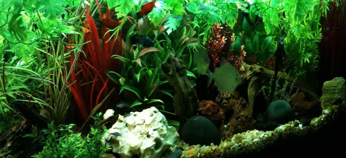 This is a 55 gallon aquarium with t-5 lighting(single coral life bulb) to keep temperature from rising too much, i have 2 marineland emperor 400 back filters operating and I use a vortex diatom filter once a week when I am cleaning the gravel and I do a partial water change 30 to 40% every 2 weeks. It has two glass tops and a canopy that I made to match the two door stand.I have a lot a very realistic plants that i purchaced at a place called Fish Gallery In Dallas,Tx. There are 2 fine air stones ( 1 at either end of the tank) that I only turn on once a night for a few minutes to circulate any old food that has settled in the plants and a 160 gph submersible powerhead to circulate debris and old food that I turn on briefly once a night as well.