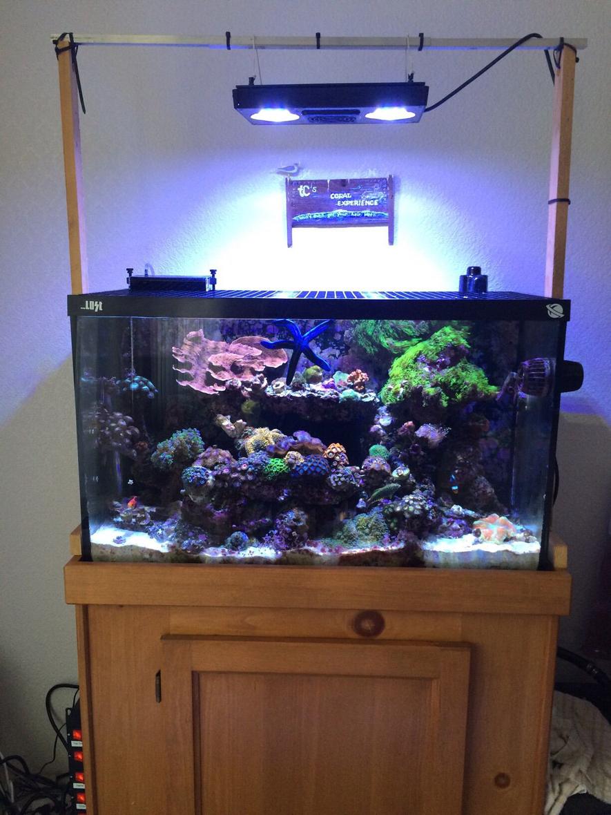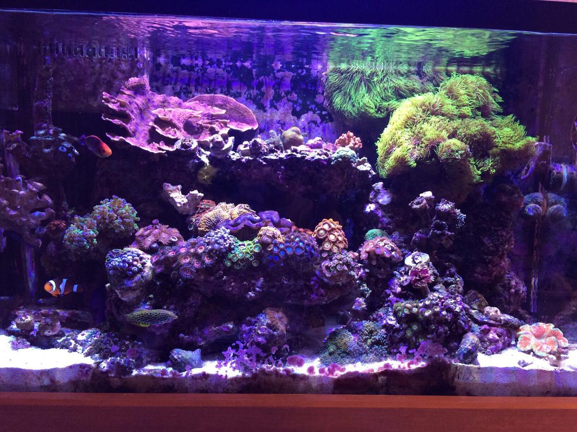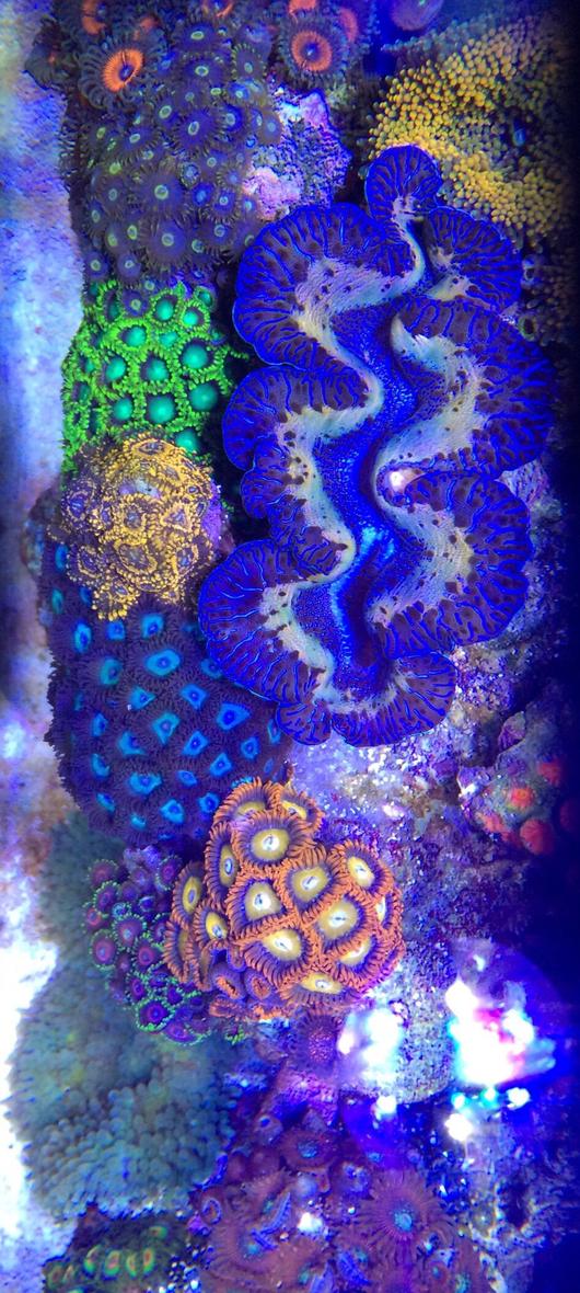 A vast amount of Zoas in my Zoa Garden. Golden Hammer, purple Tourch coral, Green and purple Frog spawn, Super man Montipora Capricornis, Chili pepper montipora, Digitata, sunset montipora, mystic montipora, rainbow montipora, Yuma mushrooms, green star polyps, Milly acropora, Maxima Clam.