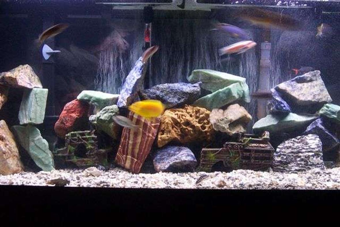 African Cichlid tank whisper power 60 filter, Penguine 350 bio wheel filter, Aqua Clear power head, some rock found in yard some bought. Surface = crushed coral and cichlid gravel.