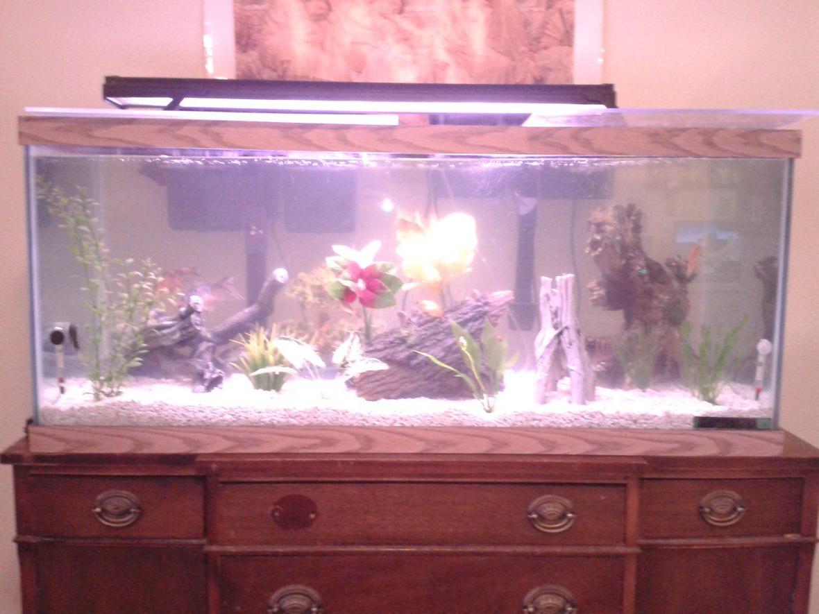 75 gallon tank with 7 goldfish, 2 plecos, 1 cichlid, 2 gouramis, and 1 betta