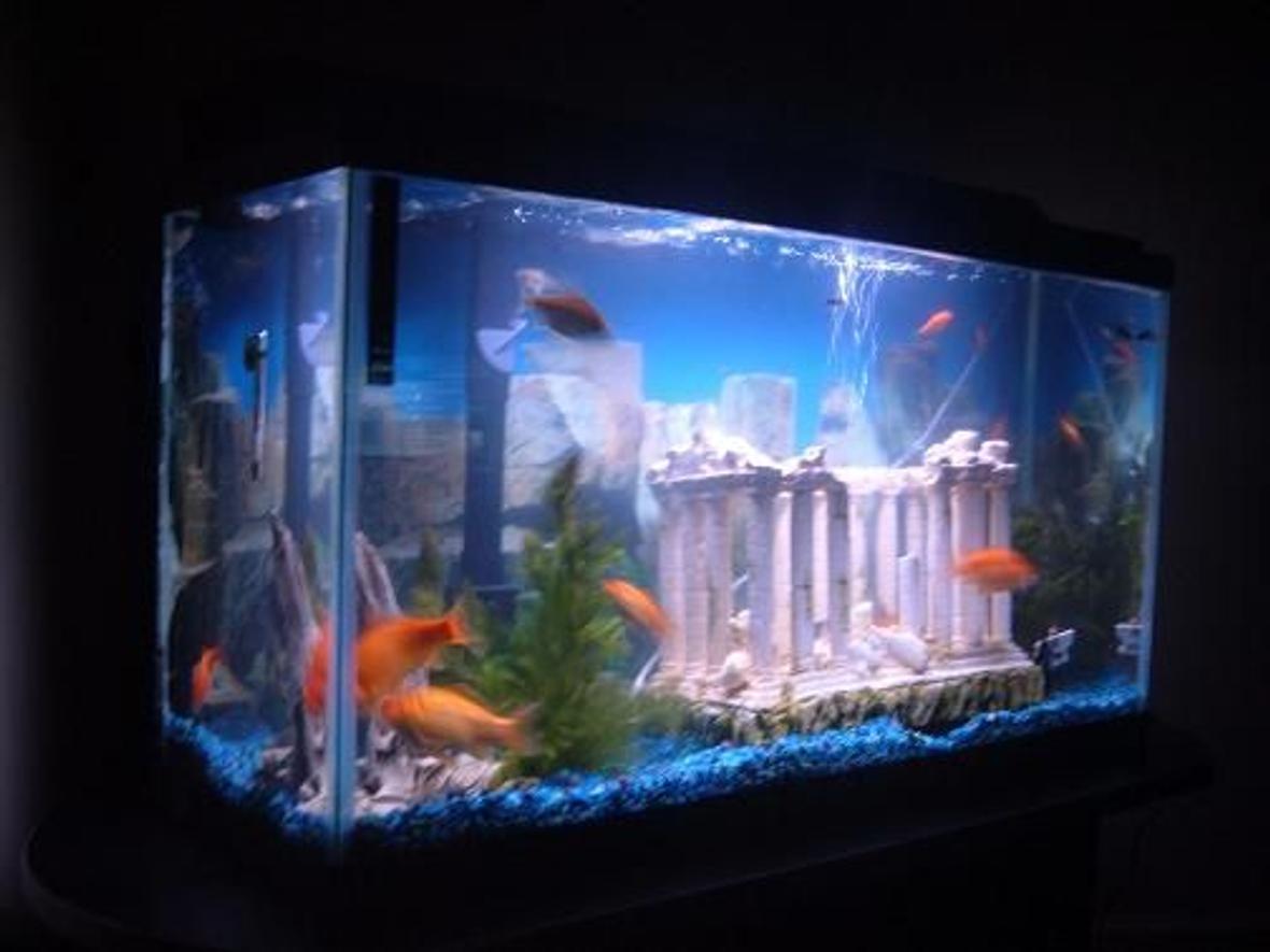 Random fish. 1 big atlantis thing ( thank you babygirl B-Day gift. )100 gallon filter. Oh and of course the 40 gallon fish tank. Two big bags of rocks. Lid and light. Underwater background. Almost forgot the no fishing sign.