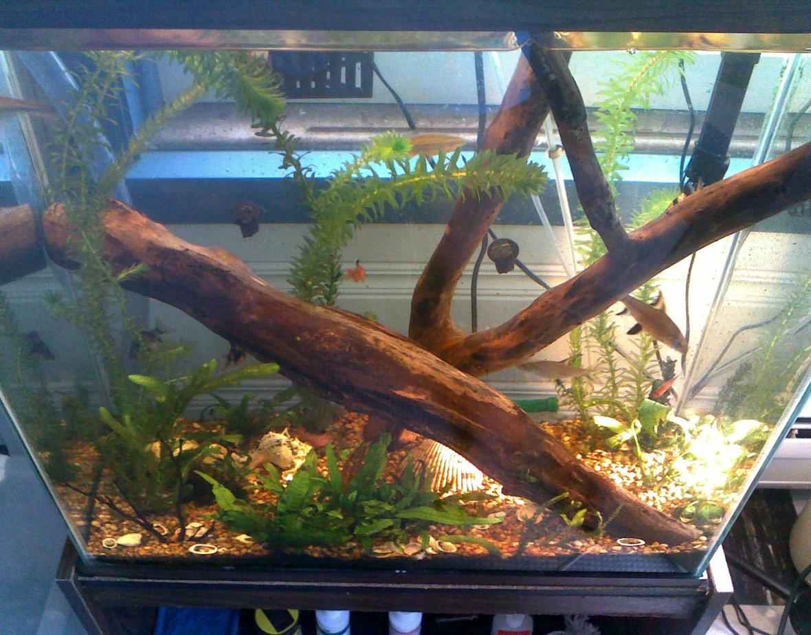 Tall well planted tank with 3 species of plants and about 15 small fish. Two HOB 150 gallon per hour filters. No carbon used. Yeast-based DIY CO2 system. Weekly 20% water changes. Two 11 watt spiral fluorescents and one halogen spotlight bulb to give specific plants extra light. DIY driftwood.