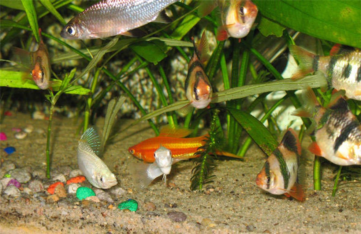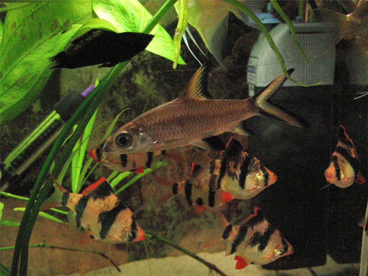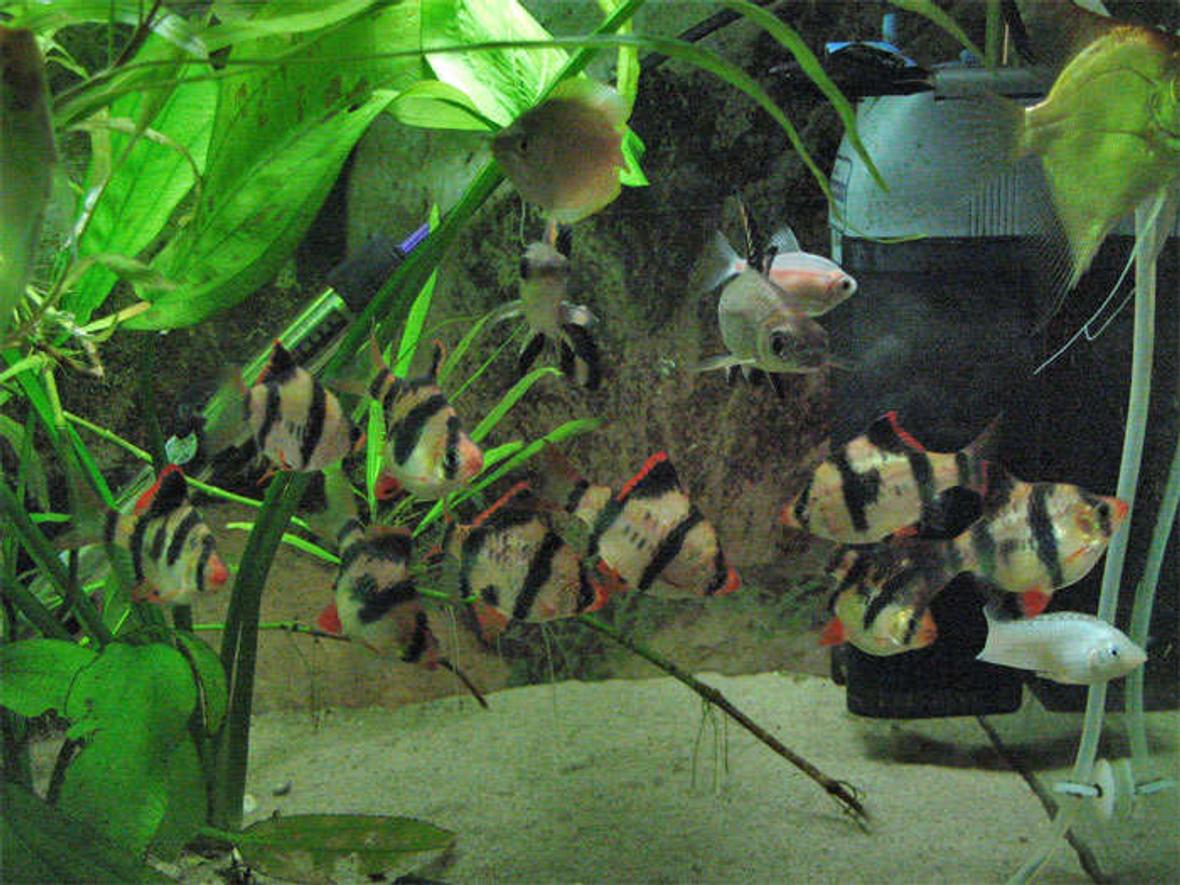 2 tricolour sharks, 7 tiger barbs, 6 white skirt tetras, 1 Chinese Algae Eater, 3 Angels, 6 Spotted tetras, 2 Zebras