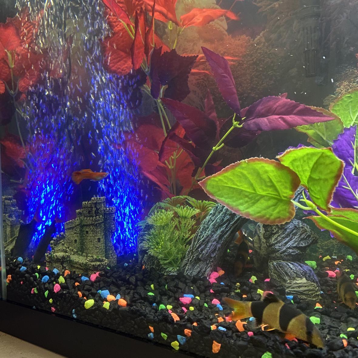 30 gallons Tall Tank with a Glofish Cycle light and white Leds on top lid. Seeking the most tropical feeling tank mates to bring peace in my enviornment. I started with a ten gallon tank and 6 Glofish with a Blue Crayfish. I slowly added more fish studying their environments and interactions. Fish will die, and they have on me, but I want to point out for newbies this is normal. I feel most passionate about my red tail shark, who is territorial, majestic, and straight up sexy, the best! My most recent additions are (in order) Green Phantom, and a school of 6 clown loaches; one being blue. In the tank also | Kisser Gourami - Guppy - Molly | Note: One Long Fin Purple Tetra, the rest of the Glofish are Normal Fin Tetras. For newbies: If putting together a Glofish tank buy long fin tetras over regular tetras. They are more difficult to find but worth the effort, being that they are more majestic in action.