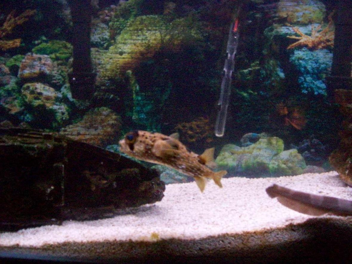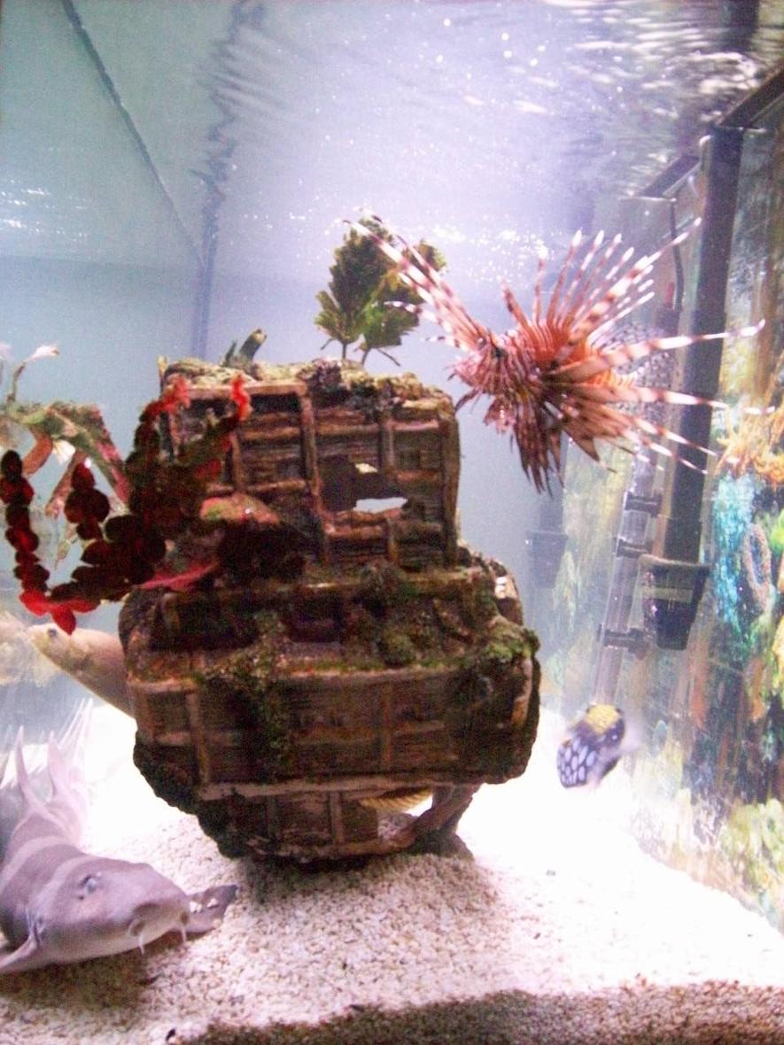 lion fish, clown trigger, banded shark,green wolf eel, porcupine puffer, white snow flake eel,and 2 horse shoe crabs