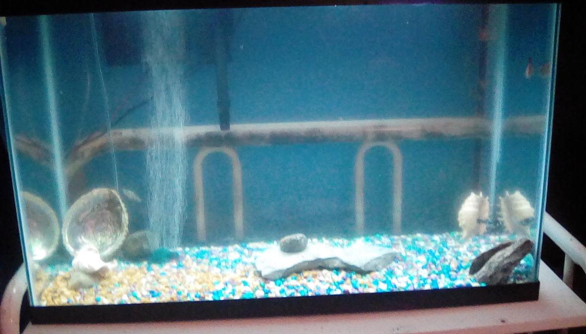 30 gallon, 18"x18"x26". Has 2 Mollies, a dwarf gourami, a peacock eel, an algae eater/pleco, and a cory catfish