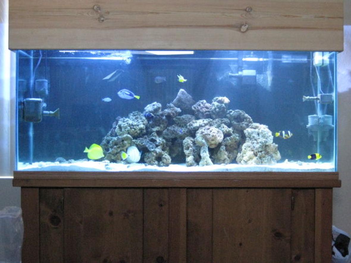 here is my new 100 gal, i had to upgrade to something bigger ! bigger is better ! i have a few new fish, but lost alot of my corals in the transfer from the 60. i have a lg sailfin tang, lg yellow tang, blue nasso tang, bi-color angel, koran angel that is in changing stage, lg clarkeye clown, i velvet damsel, i green chromis, 2 black spotted damseld, i blue/yellow damsel, 1 grey stingray, 1 snowflake eel, 1 orange spotted sand sifter goby, 1 coral banded lobster, 10-15 blue legged hermit crabs,3 mushroom pollups.