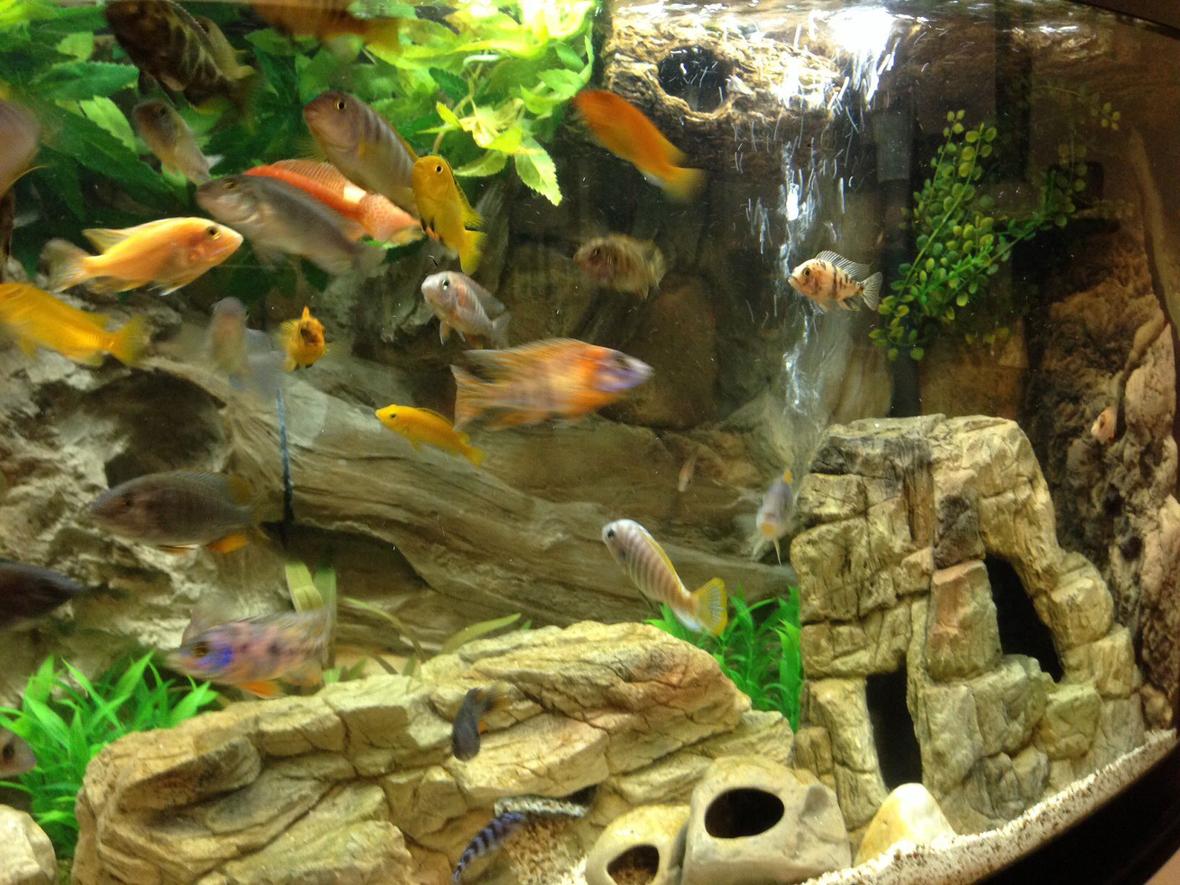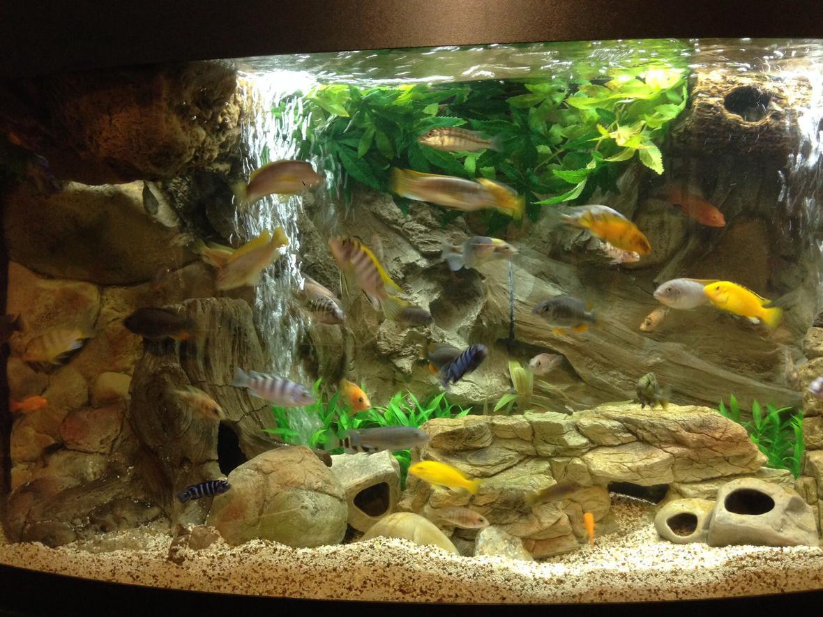 Mixed African cichlid tank. 72 gallon bow front aquarium with 3D background and many 3D elements. Mixed malawi cichlids and peacocks.