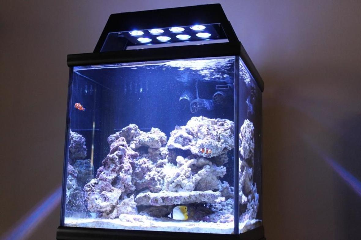 20x18x20. Black stand with semi-transparent glass door. Aqua Illumination Sol Blue with custom light inclosure. Custom 14g acrylic refugium, sock filter, live rock rubble chamber and hang on back Reef Octopus skimmer.