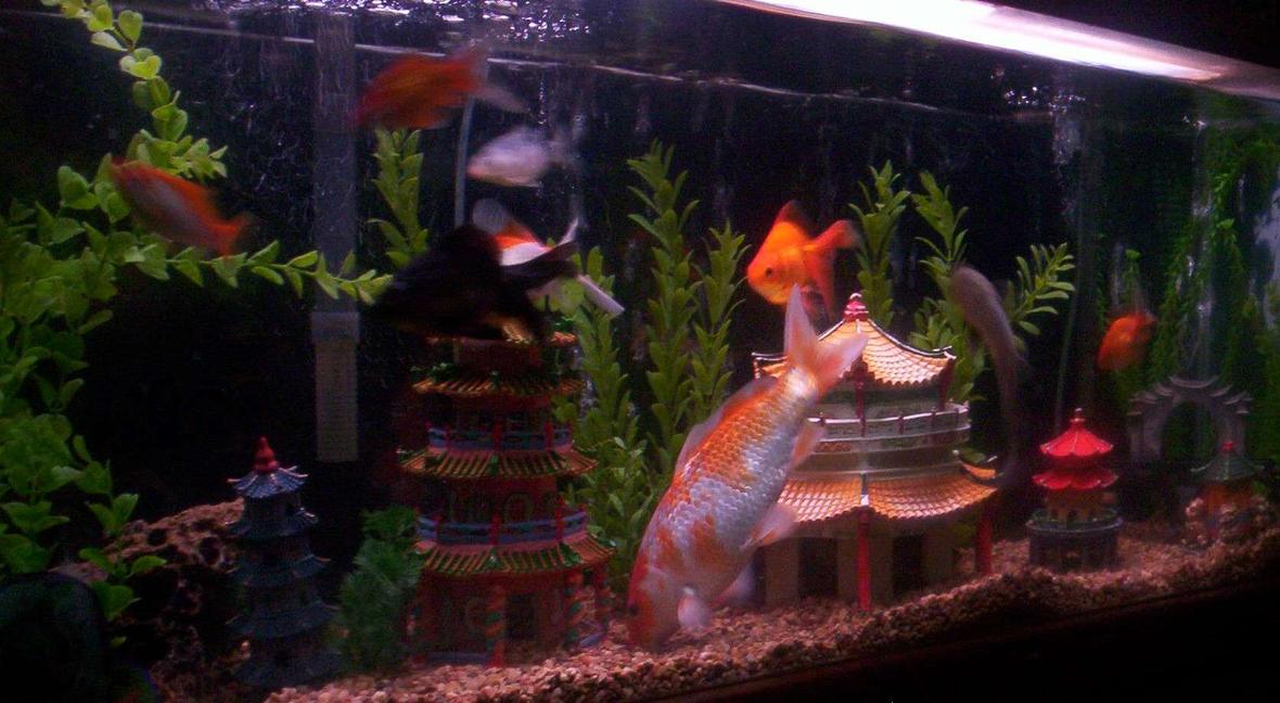 I recentley upgraded to a 55 Gallon tank from a 29 gallon due to the fact that my Koi fish couldn't move around...Now he's loving the big tank. We have a 30-60 filteration that keeps it cleaner longer.. also thanks to our airstones because Gold fish are kind of messy! I fond that if you own a tank the easy way to clean it is with a suction pump & old fashion bucket. As for decor we went with our living room theme of asian decor...pagondas...temples....great walls...bridges. When your looking at decor just remember to match it with your personality. Good luck fellow hobbyists.