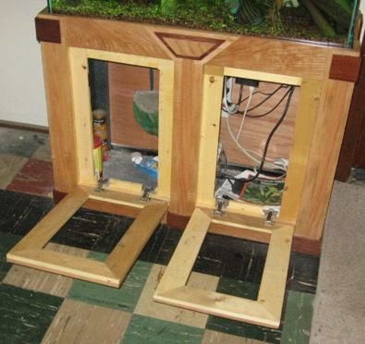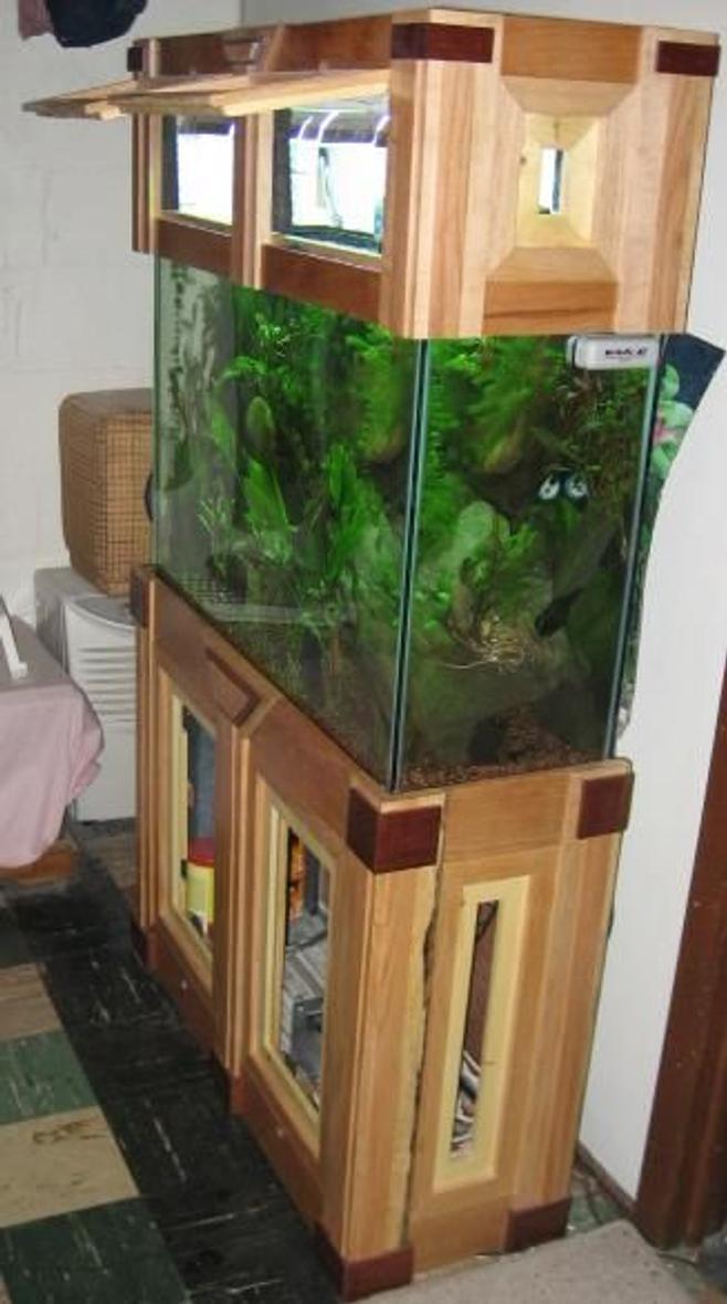 I believe the tank measures 12x38x23. The stand is custom built by Allen Brothers (716-381-3520). There were six different kinds of woods used in the construction of this stand. (Red mahogany, maple, brazilian cherry, american cherry, pine and various cuts of oak.) There will also be panes of frosted glass inserted in the centers of all the doors as well as on the sides of the stand and canopy. There will also be lights installed in the stand so when both the canopy and stand lights are illuminated, they will shine through the frosted glass. I am currently using a 50/50 (6000k/Actinic) and a 10000k Metal Halide. I find the actinic tends to bring out the vibrant shades of blues and violets often lost with basic lighting. For filtration I am temporarily using a 400 series Emperor. I plan to upgrade to the Magnum 350 Bio Pro System.