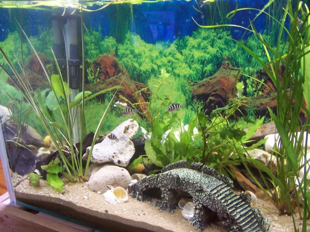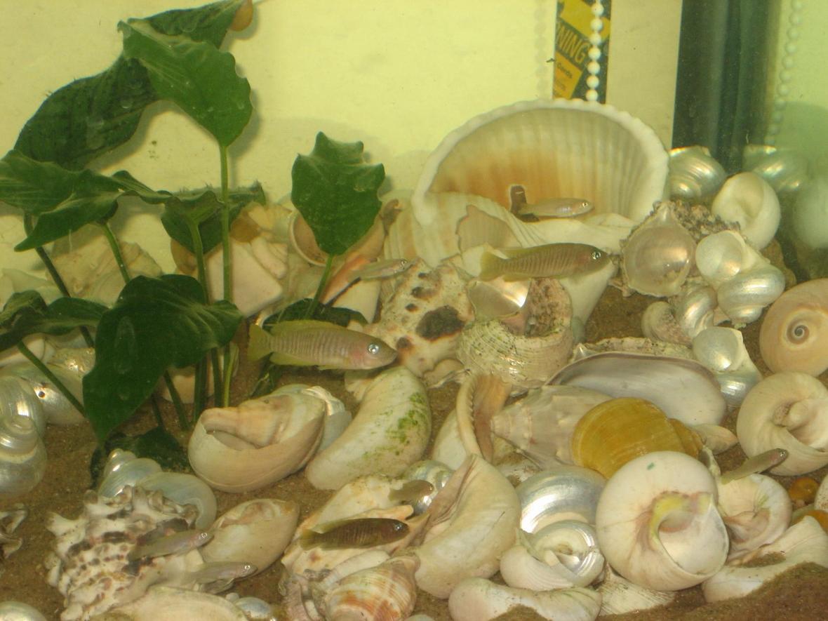 Hump Heads (4), Shell Squaters (30+), Discus(2), Krebs(20+), Nicaragua Parrots(2), Bristle Nose(200+), clown loaches(3), snails(lots), Killi fish (4), upsidedown catfish(1)