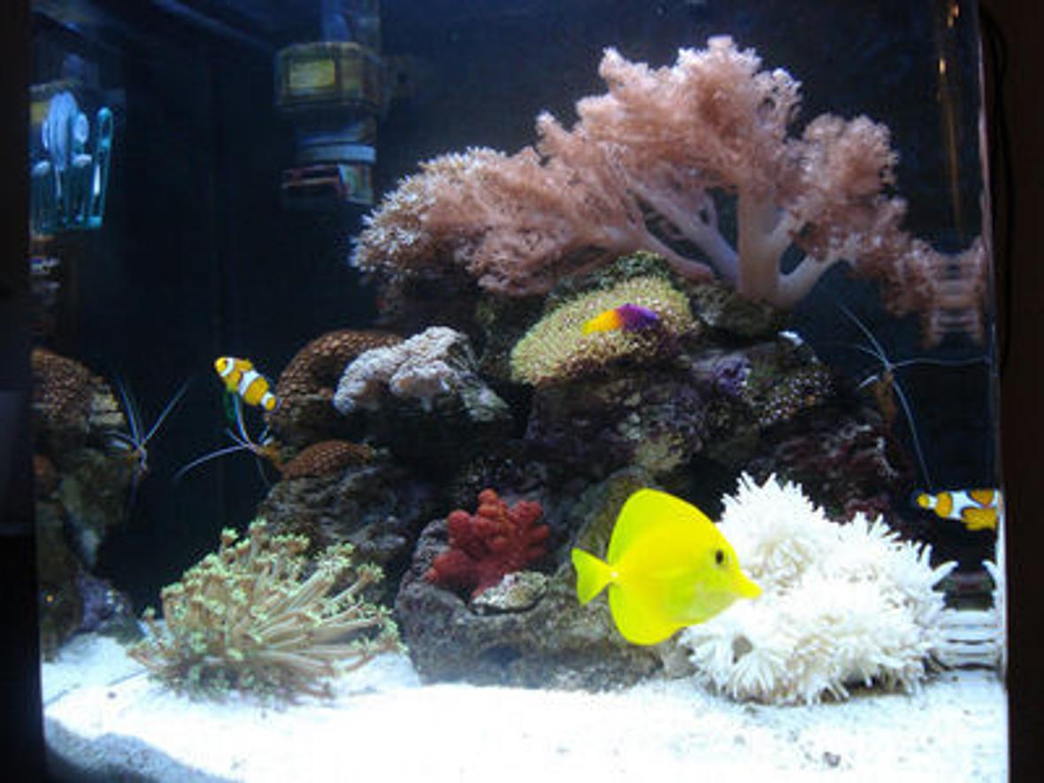 Yellow tang, clown fish, royal gramma, starfish.