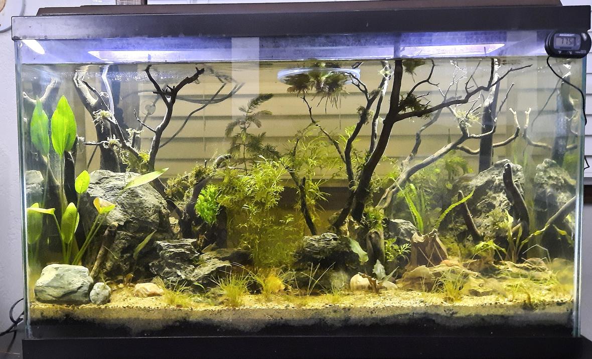 Low-tech/Natural(based on Father Fish, no chemicals/only sponge filter)Substrate: 1 inch peat moss, compost, planting soil & FF supplement, capped with 2 inches of play sandSeriyu & Dragon stone, Manzanita branches & local water driftwoodLights: Seaoura & Tetra Heater: Fluval T150