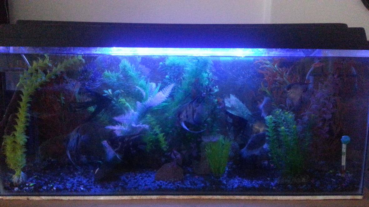 Basic tank. Lots of fake plants. Bubbles created by the 2 filters. Im using sera blue lighting.