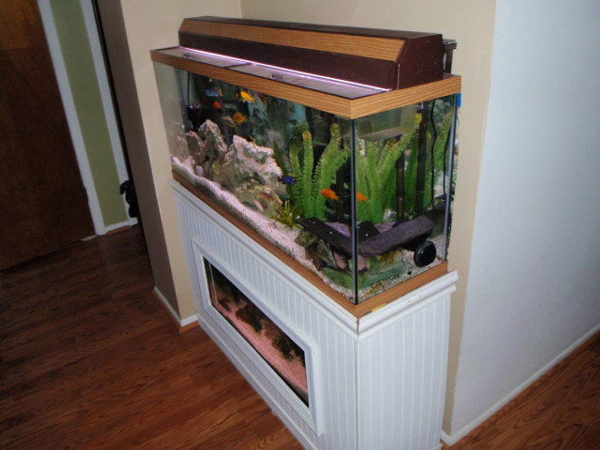 the top tank is a 55 gallon african chiclid tank with an array of chiclids in it. the bottom tank is a 20 gallon south american tank