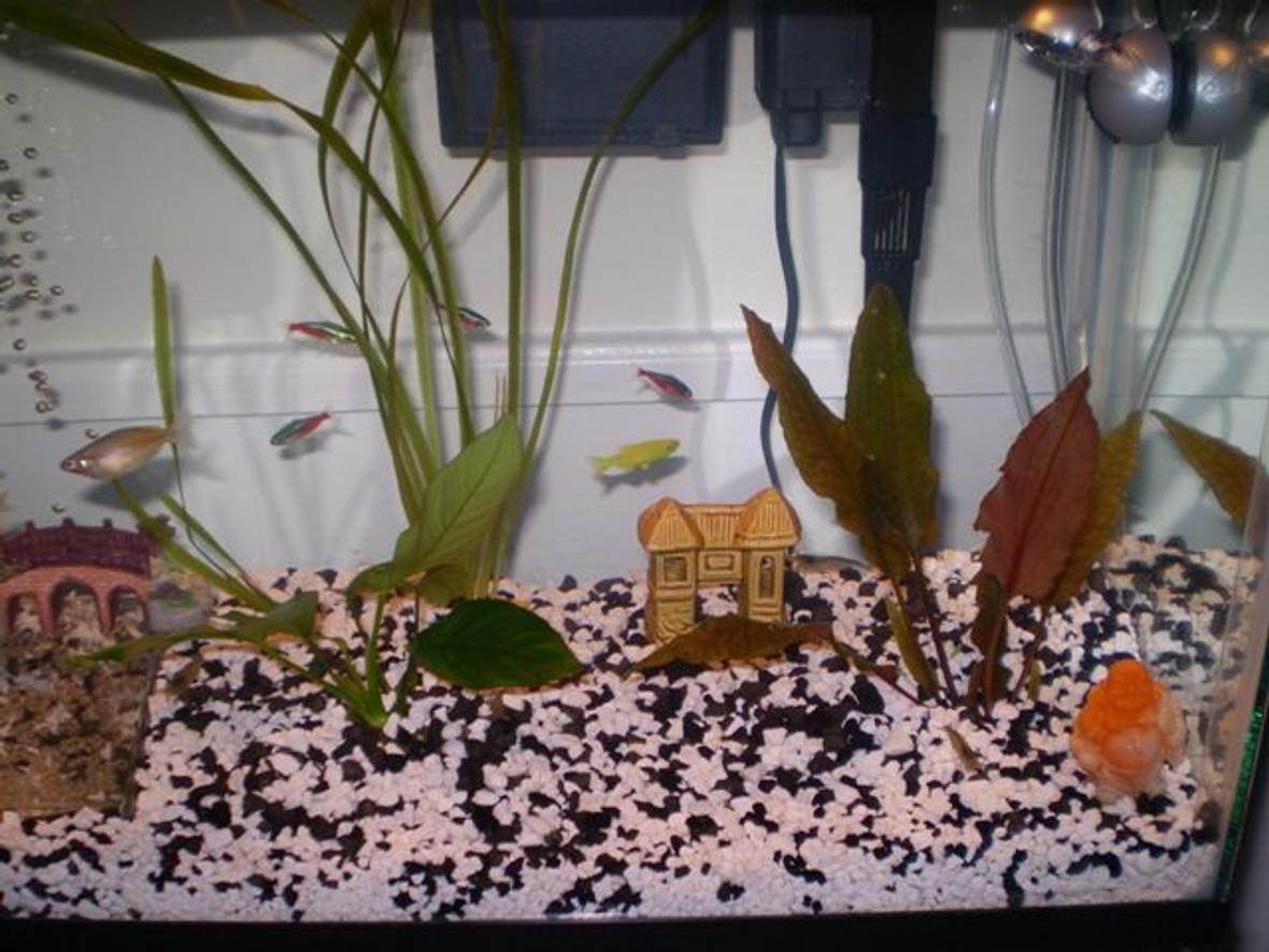 2 upside down catfish. 2 neon tetras, 4 cardinal tetras. 3 glo-fish zebra danios. 3 japanese amano shrimp. 1 bosemani rainbow fish. 1 random snail that got in on a plant