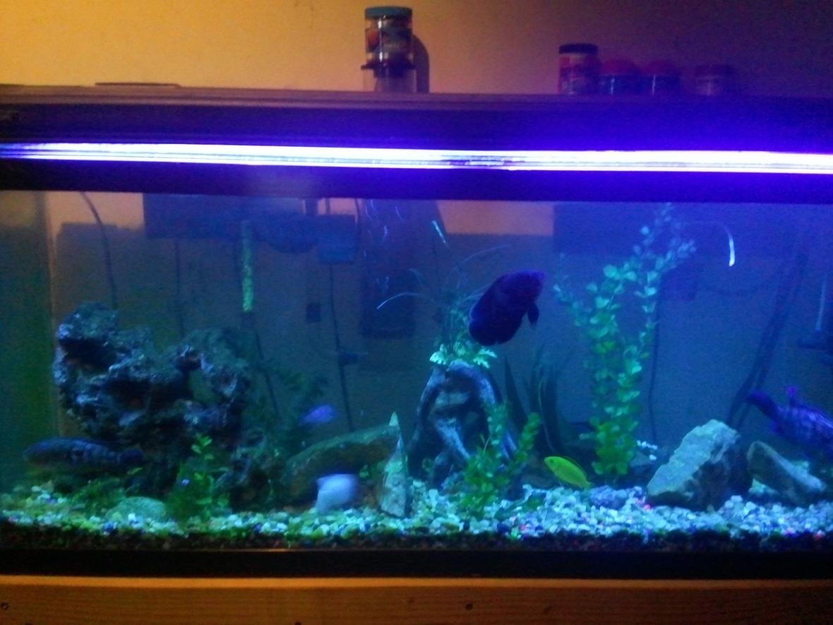 mixture of chiclids ,weather loach,mystery snail and cone snails,lighting:Coralife actinic 65watt double prong, double light in each outlet,4 outlet,also 4 moon light leds built in but not working....second light is a marine glo 54 watt with another t5 white light i think 12,000k
