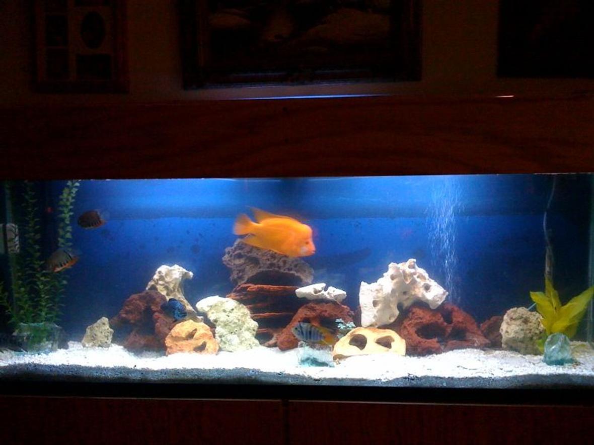 One large Red Devil, two Jack Dempsey, two Green Severum, two over breading Convicts and two large plecos to keep the tank clean.