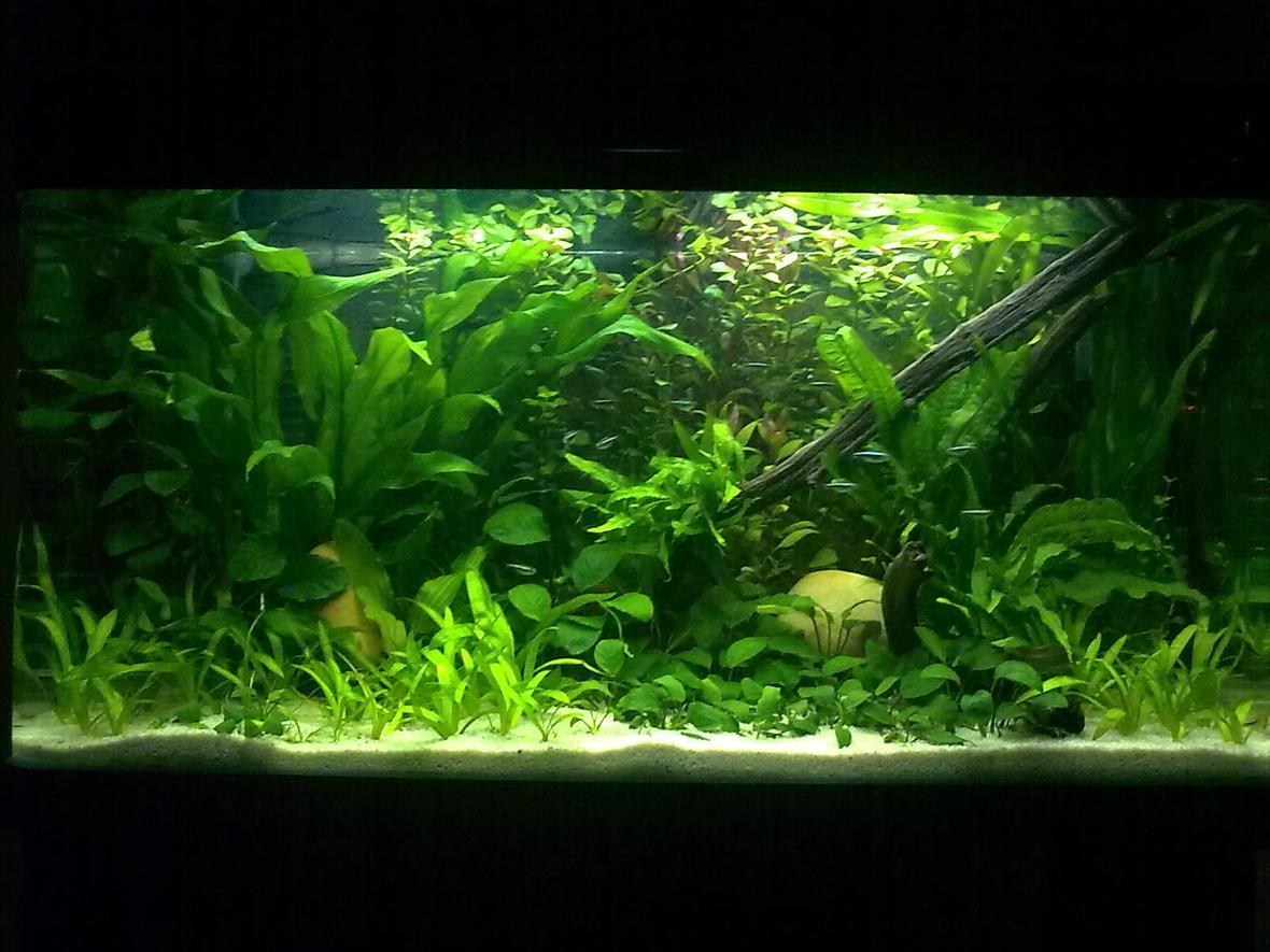 Tank is 100cm (length), 46cm (width), and 50cm (hight),1* canister filter running the set-up @ 650 lh. It's got 2 * 25w plantgrow lux, flo's 4500K, & 1 * sun lux, flo 6500K lights. DIY CO2 with Hagen Diffuser. Pool filtr sand with Hagen plant grow sticks mixed in. Weekly dosage with Sera Florena, and 25% weekly water changes.