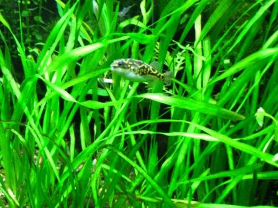 Our first 46 Gallon Bow Front is home to our Baby Oscar "Oggy" for now (Don't worry he will be upgraded to a bigger tank.) Our second 46 Gallon Bow Front is home to 1 Red Tail Shark(Scooby who owns the tank), 2 Glo-Light Tetras, 1 Cloud Minow, wayyyyyy to many guppies to count, 2 Mystery Snails, and various other snails which I have no clue how they got in there. The 10 Gallon is our Snail tank, which we use to breed snails for our puffers. And our 75 Gallon Planted tank is home to 2 Figure Eight Puffers, 7 Dwarf Puffers, 4 Bumblebee Gobys, 2 Flying Foxes, 1 Large Red Tailed Shark "Jaws", 4 Hill Stream Loachs, and many a ghost shrimp.