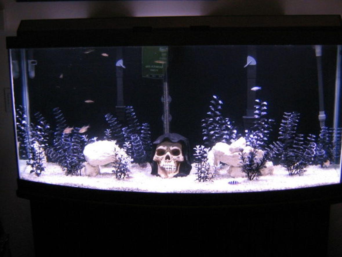 Bow Front Fish Tank Fresh Water , with Fluval 304 Canister Filter, Penguin 350 and 200 Power Filters, Jager 250W Heater, Black Pearl Plants (fake), a few use to be reef rocks, And what else do I you want to know? The Skull is actually a penny bank that gives the tank an aggressive look in some way. More to come -I just started the hobby!