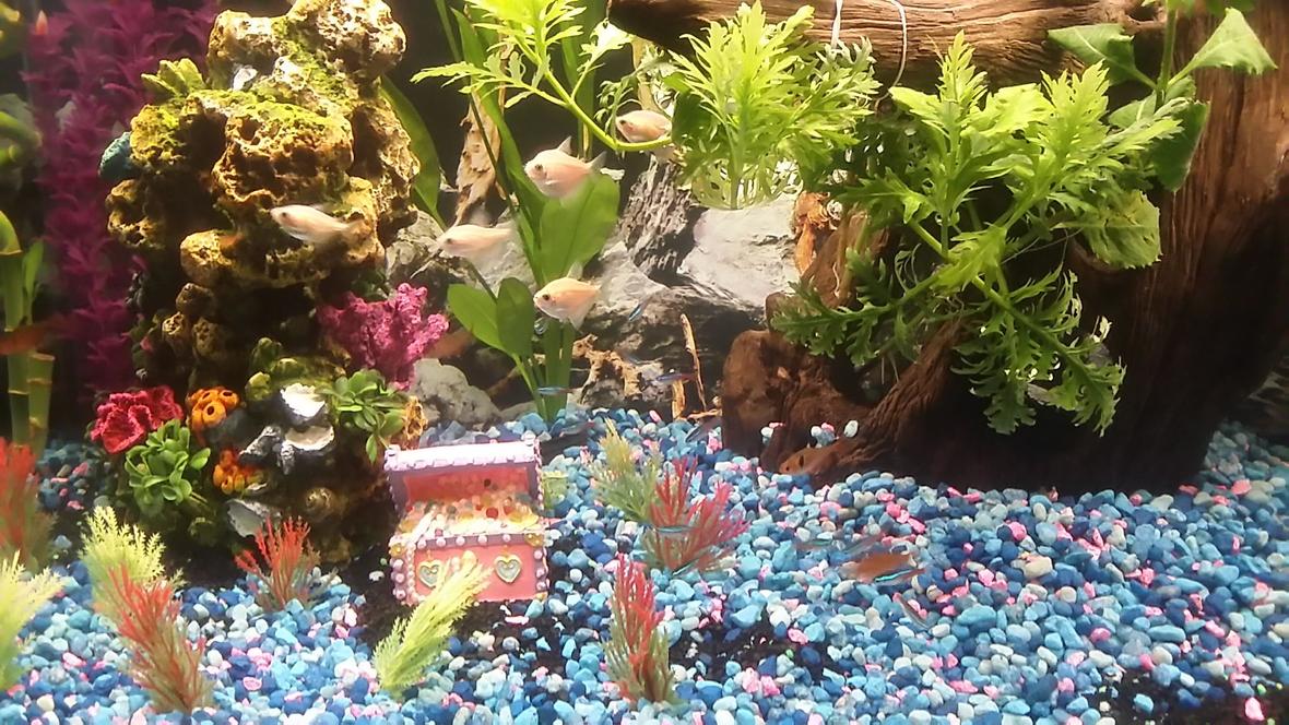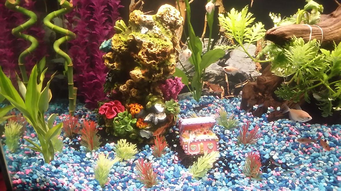Work in progress. 6 live plants, multiple fake plants and decor, DIY princess castle coming soon.Sunsun hw-403b canister, whisper 30-60 hob, ecolux f40 t8.