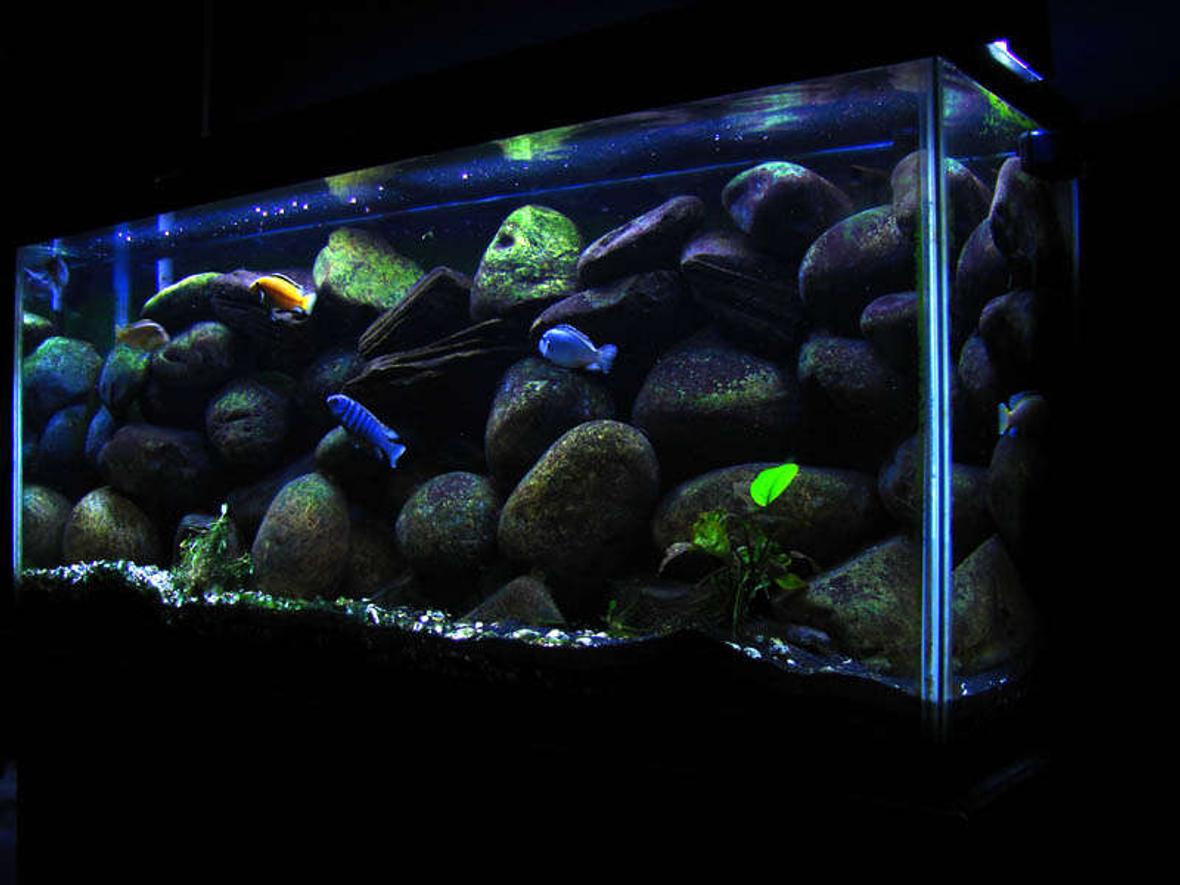 Mbuna setup lots of rock, 250lbs. I have 8 assorted malawiis right now along with a pleco and senegal bichir. I hope to add more in the future. Using a Fluval 405 canister and an inline 300W heater. Also a dual hood with 1 5500k 48in light and an actinic 48in, both 32 watts. Just put 2 moonlights in and have the whole system on a day/night lighting timer.