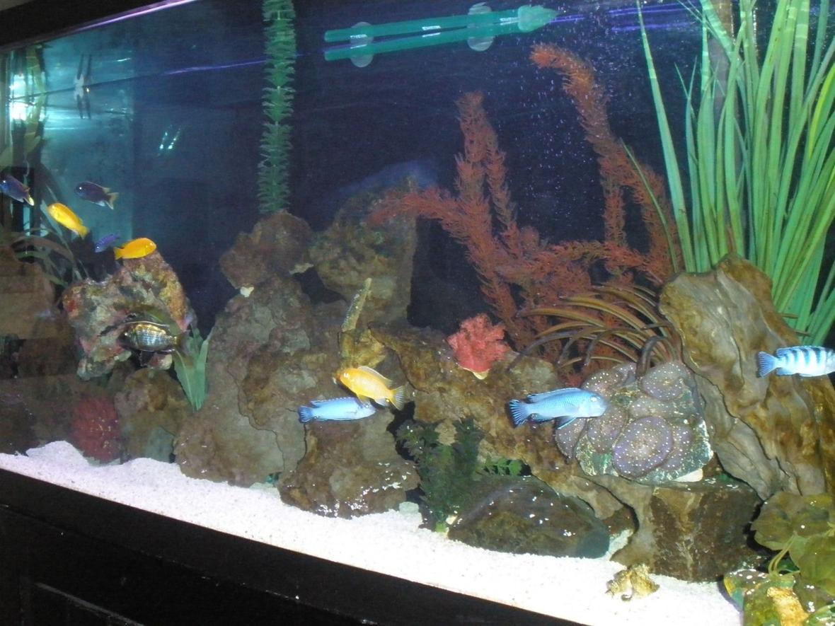 120 gl. Eheim canister 2217 and Whisper 60 power filter,2 stealth heaters, 140lbs lace rock, artificial plants. 4 electric yellow,2acei,2venustus,1demasoni,2socolofi