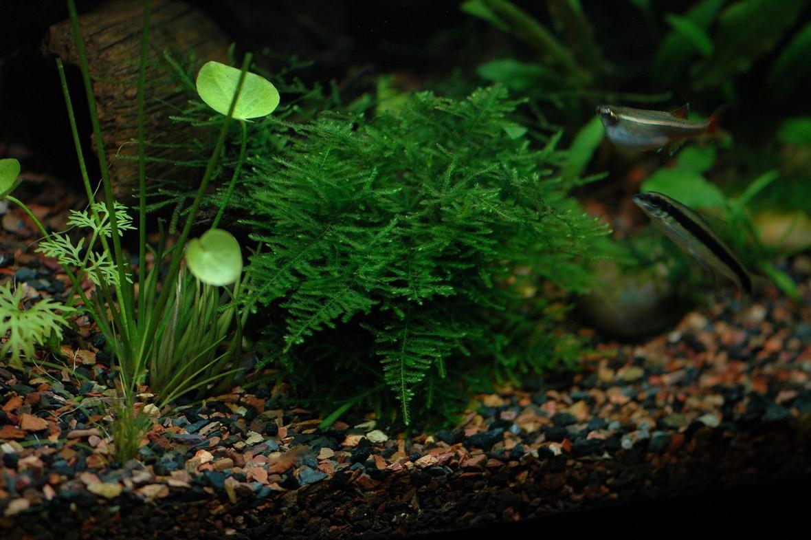 Java moss, peacock moss, crypts, lace fern, temple plant, wisteria, penny wort, some kind of sword, Vallisneria, banana lilies, anubias and a red tiger lotus