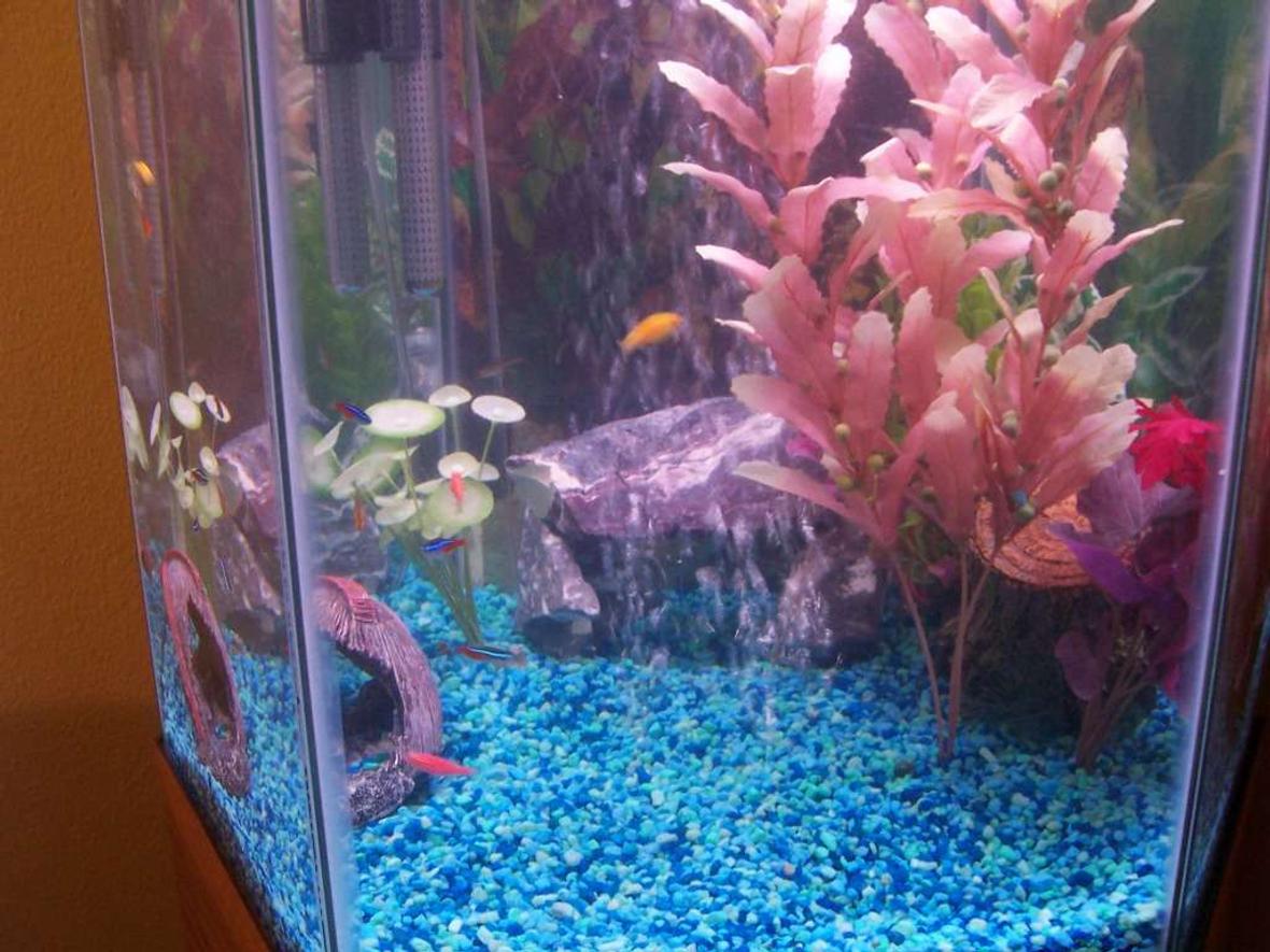 5 Glofish Danios, 5 Neon Tetras, 3 Glolight Tetras, 1 Algae Eater, 1 Rainbow Shark, 1 Dwarf Frog , 1 Guppy, 2 Danios