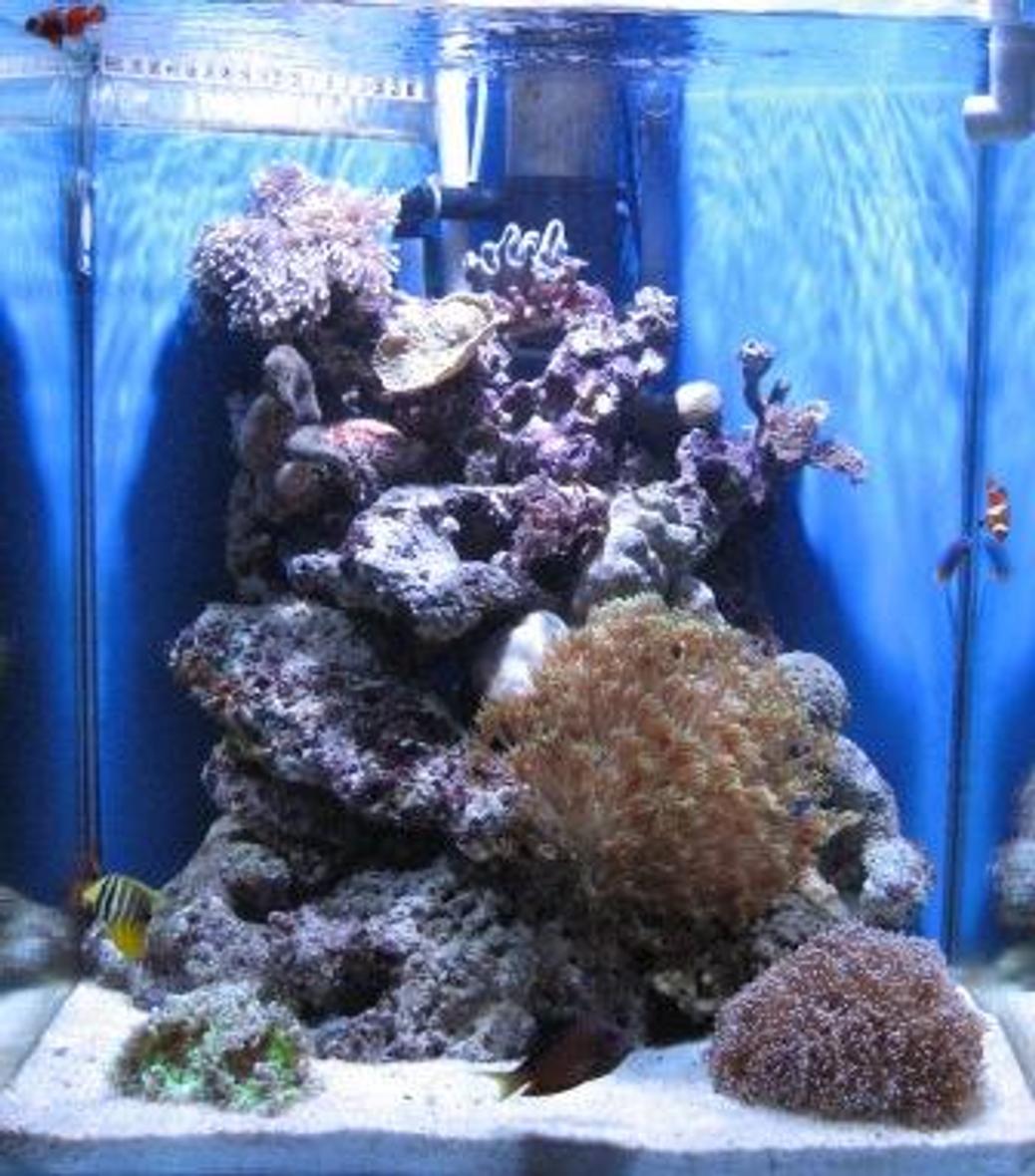 The tank is about 2 months old. The tank dimensions are 24x24x24. (A small tank) The lighting is a 1 x Mozoo all in, 1 x 150w metal halide with 14000k bulb and 2 x 18w actinic fluro tubes. The filteration for the tank was designed and made by my self, at the back of the tank there is an overflow that runs through a filter pad and passes through to the bio balls and past live rock all the levels are divides by plastic with small holes driled this is to create a rain effect,finale a power head (Tota) returns the water back to the Tank,I split the return water flow in two half going to the front of the tank and the other half to down to the bottom of the tank with a spray bar to push the water through the live rock. At the back of the tank is a Queen Turbo Skimmer with a power head attached. New addition was a TECO chiller.